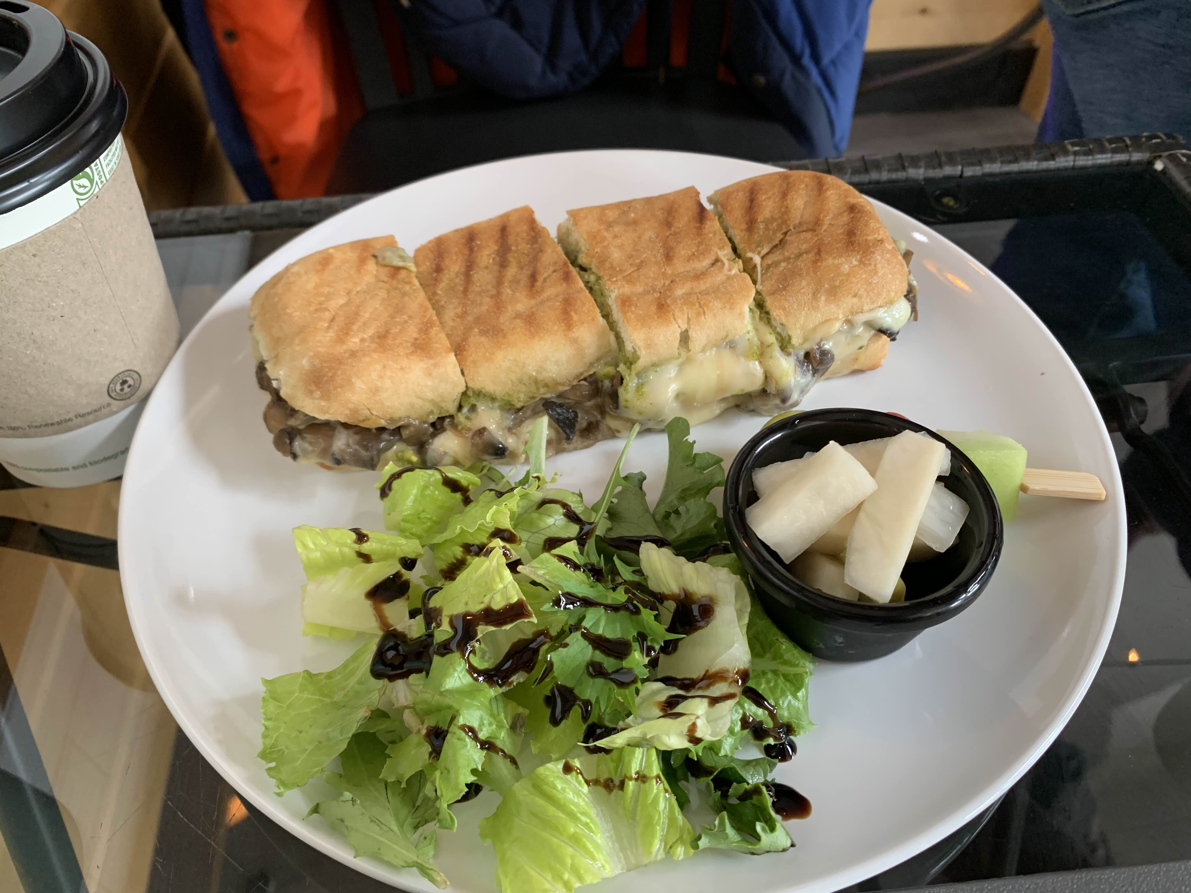 머시룸 파니니는 정말 맛있게 먹었다!! 페스토도 때문에 이것도 쫌 짭짤한 테 그래도 진짜 버섯이 아낌없이 들어있어서 맘에 들었다! 카라멜라이징 한 양파도 그렇고 다 너무 맛있어!