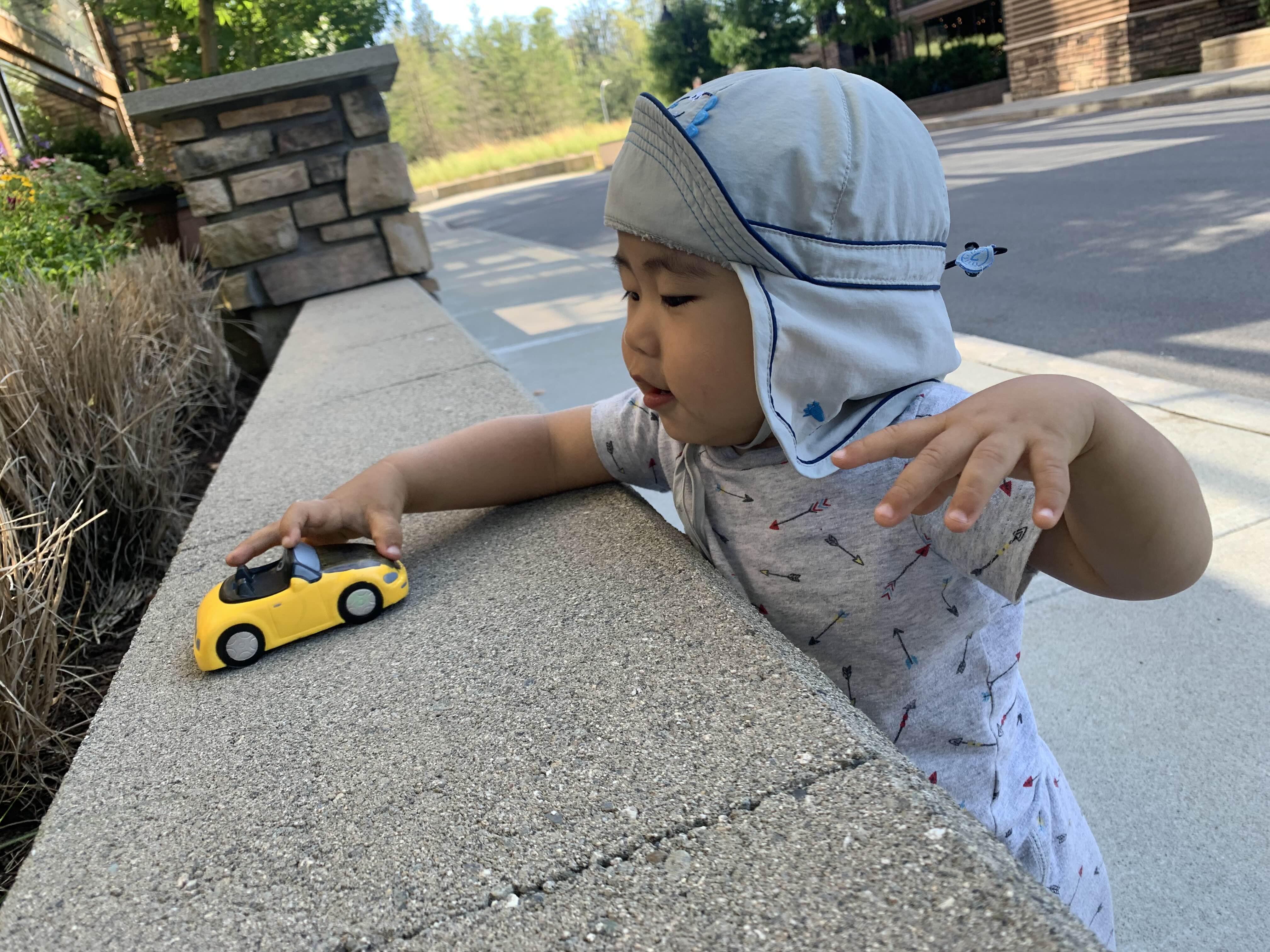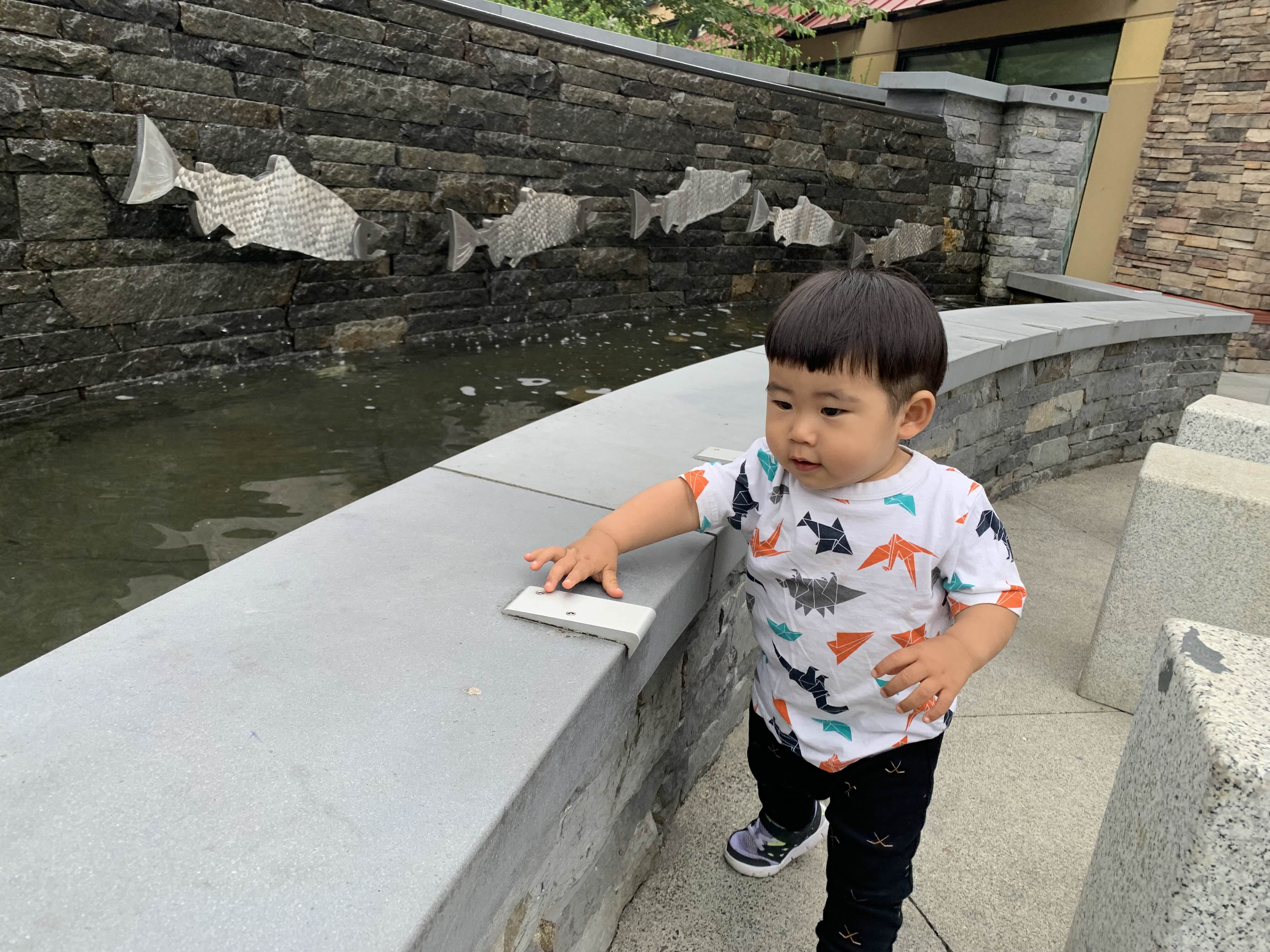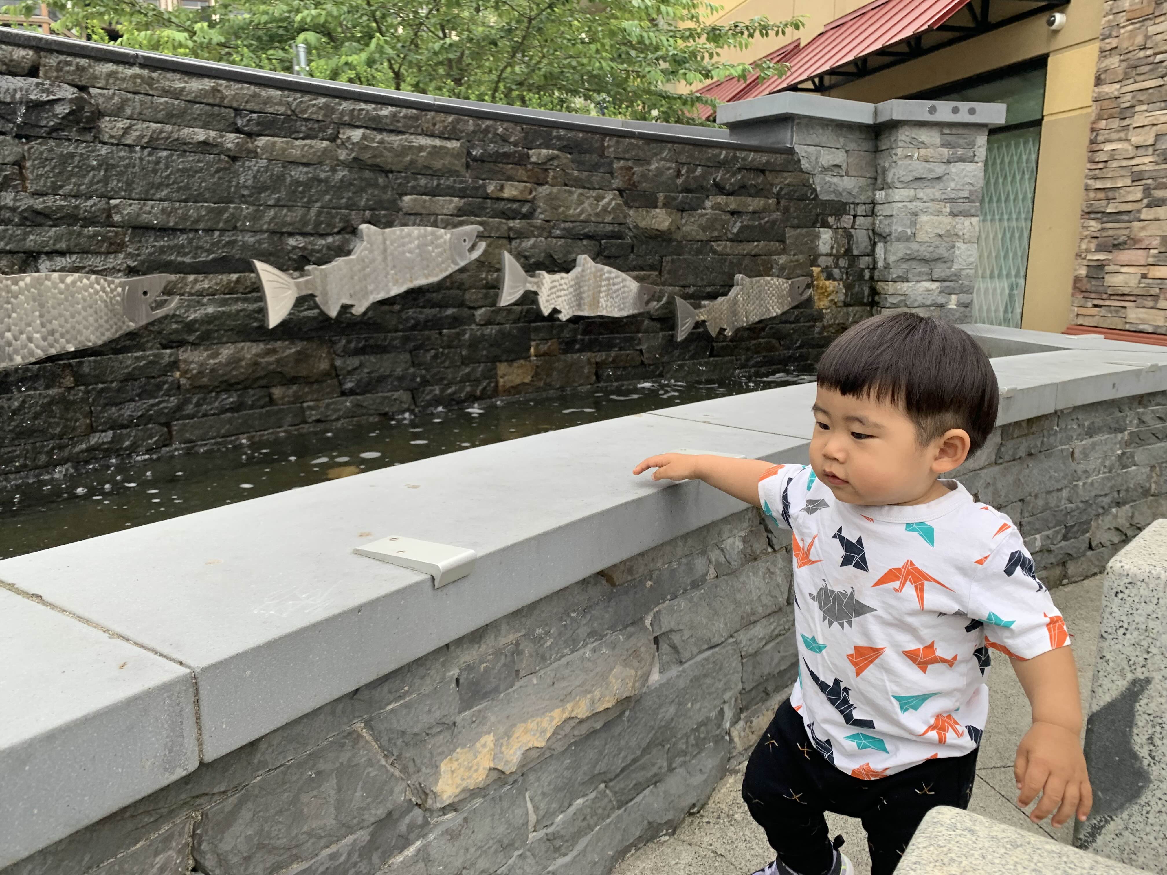 집 앞에 분수도 너무 만져보고 싶은데, 너무 멀어요~ 아직 팔이 안 닿아서 엄마 아빠는 천만다행이에요!