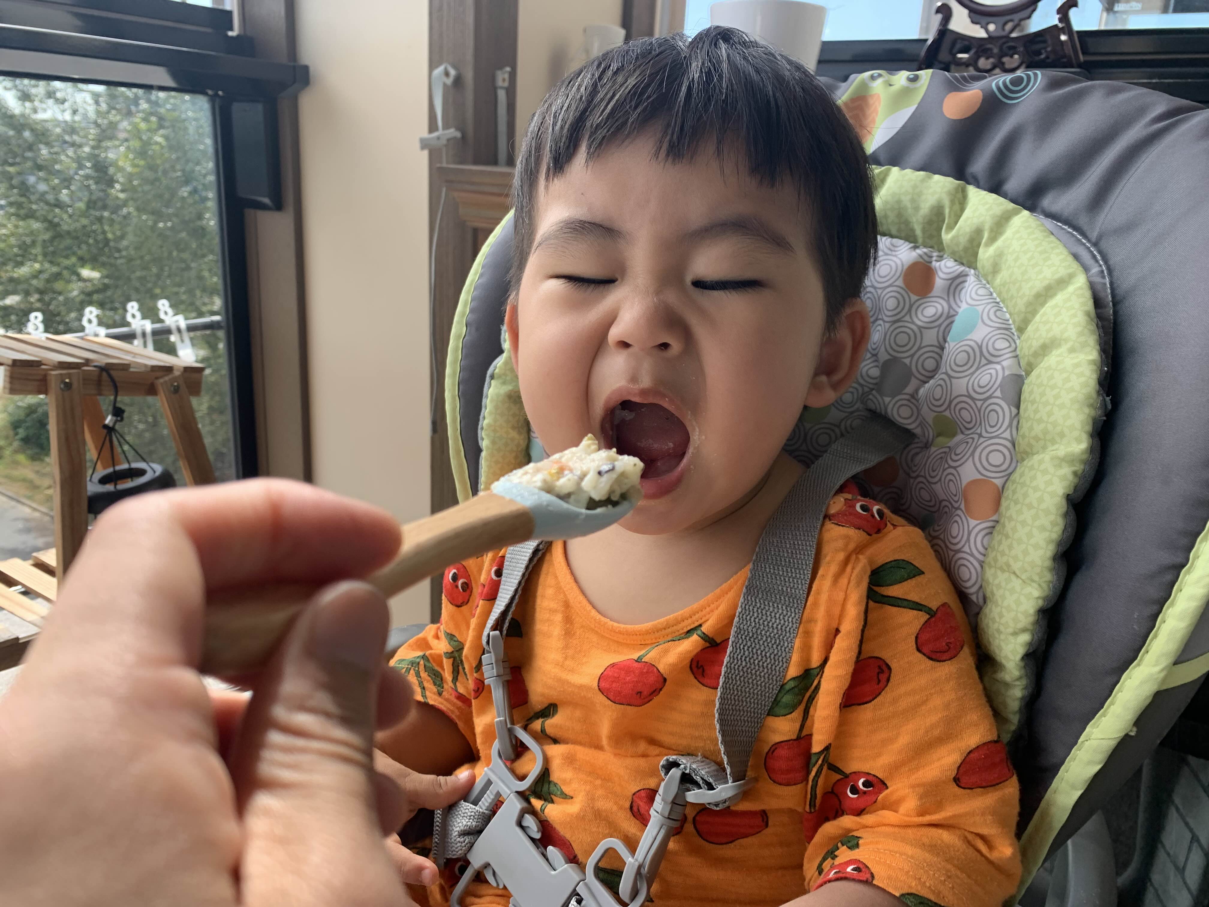 아빠한테 딱 들켜서, 뺏기기 일보 직전.. 한 입만 딱 더 먹고요!! 하는 표정으로 와~앙! 하고 결국 아빠한테 뺏겼습니다...