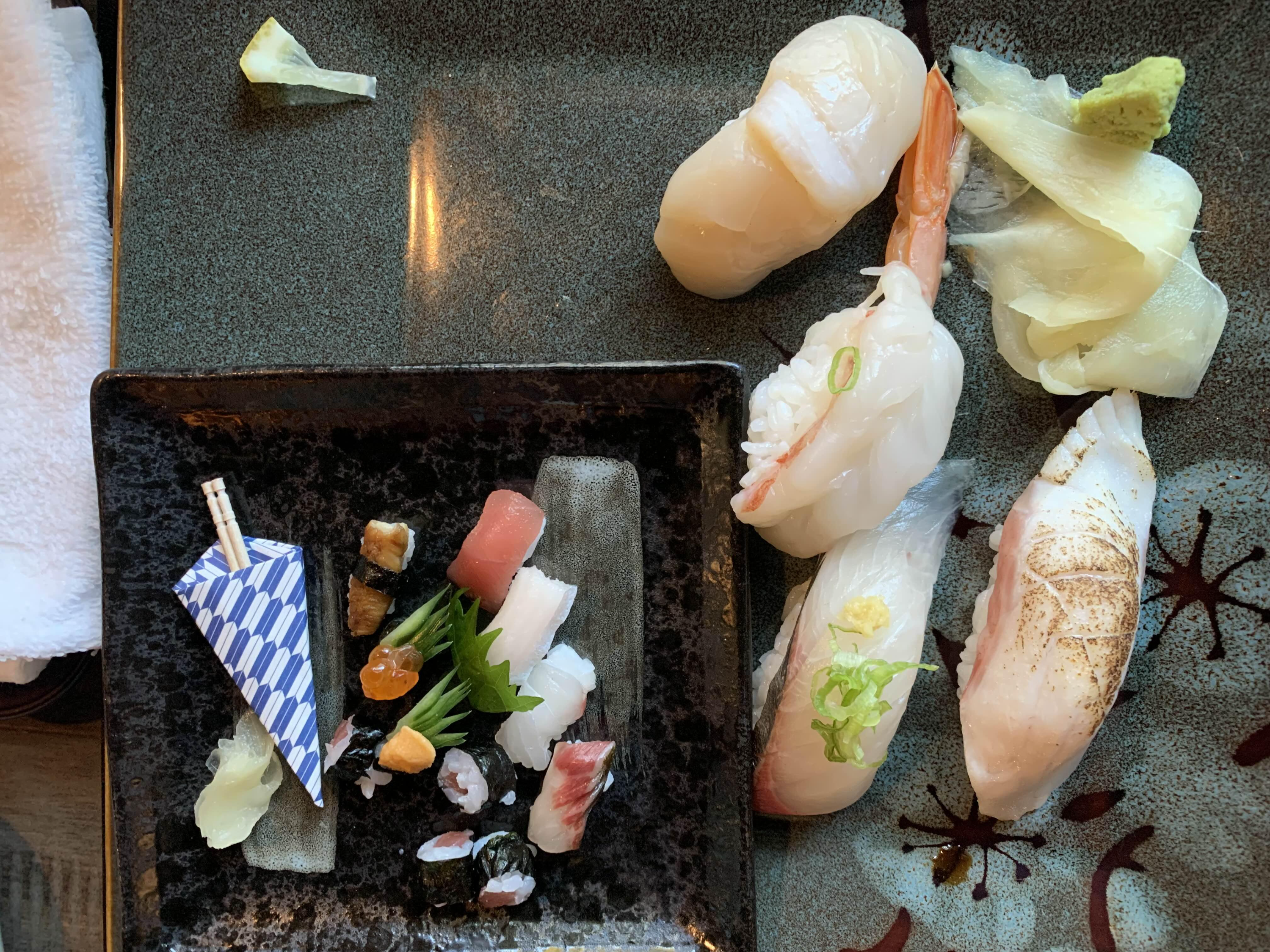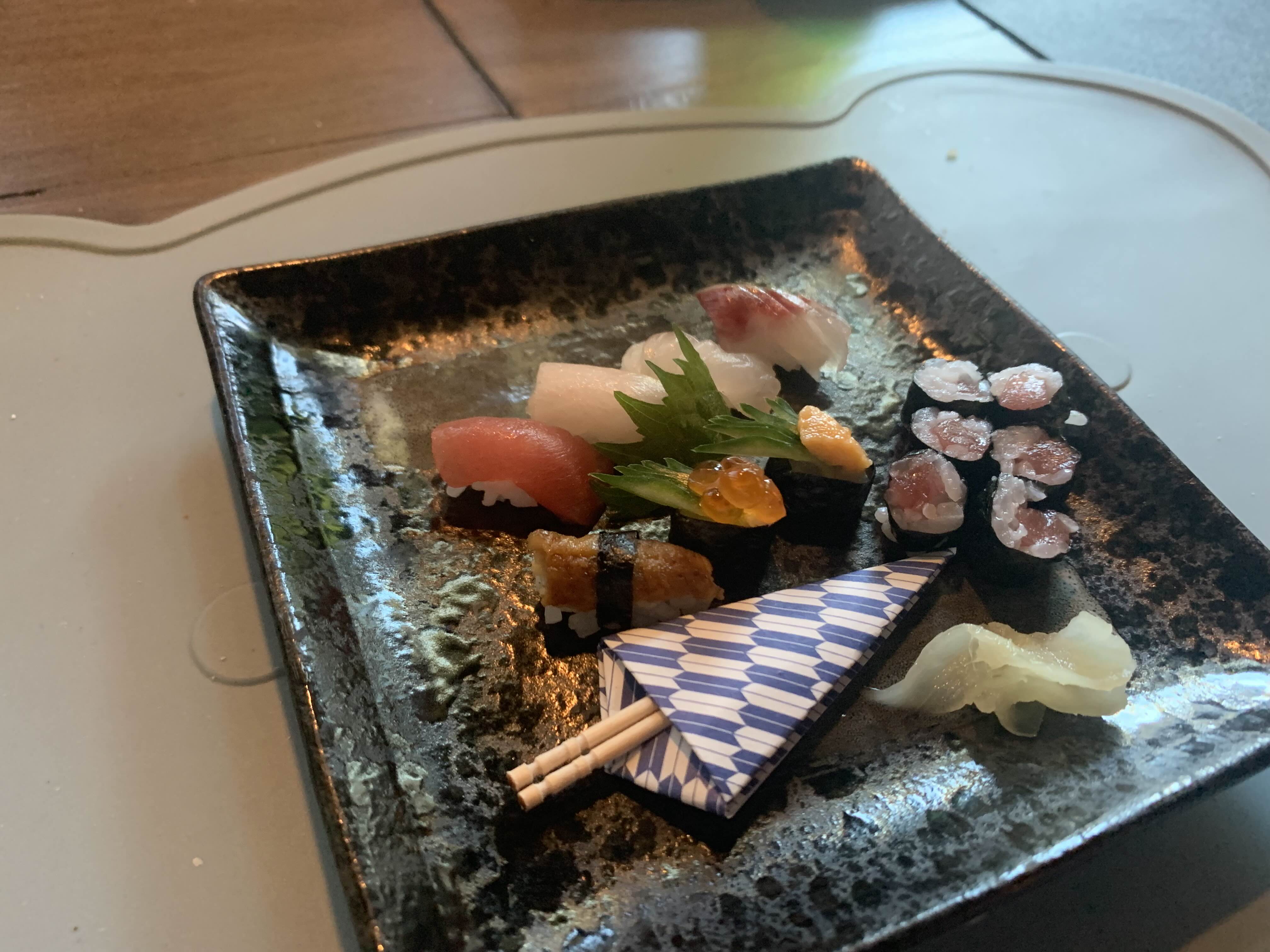 우리가 간 곳은 예약해서 오마카세 메뉴를 먹어볼 수 있는 곳인데.. 감동했던 게... 태오를 위해서 이렇게 미니 초밥 세트를 만들어 줬다.. 심지어 진짜 다 우리 메뉴에 있는 회로 만들어서!