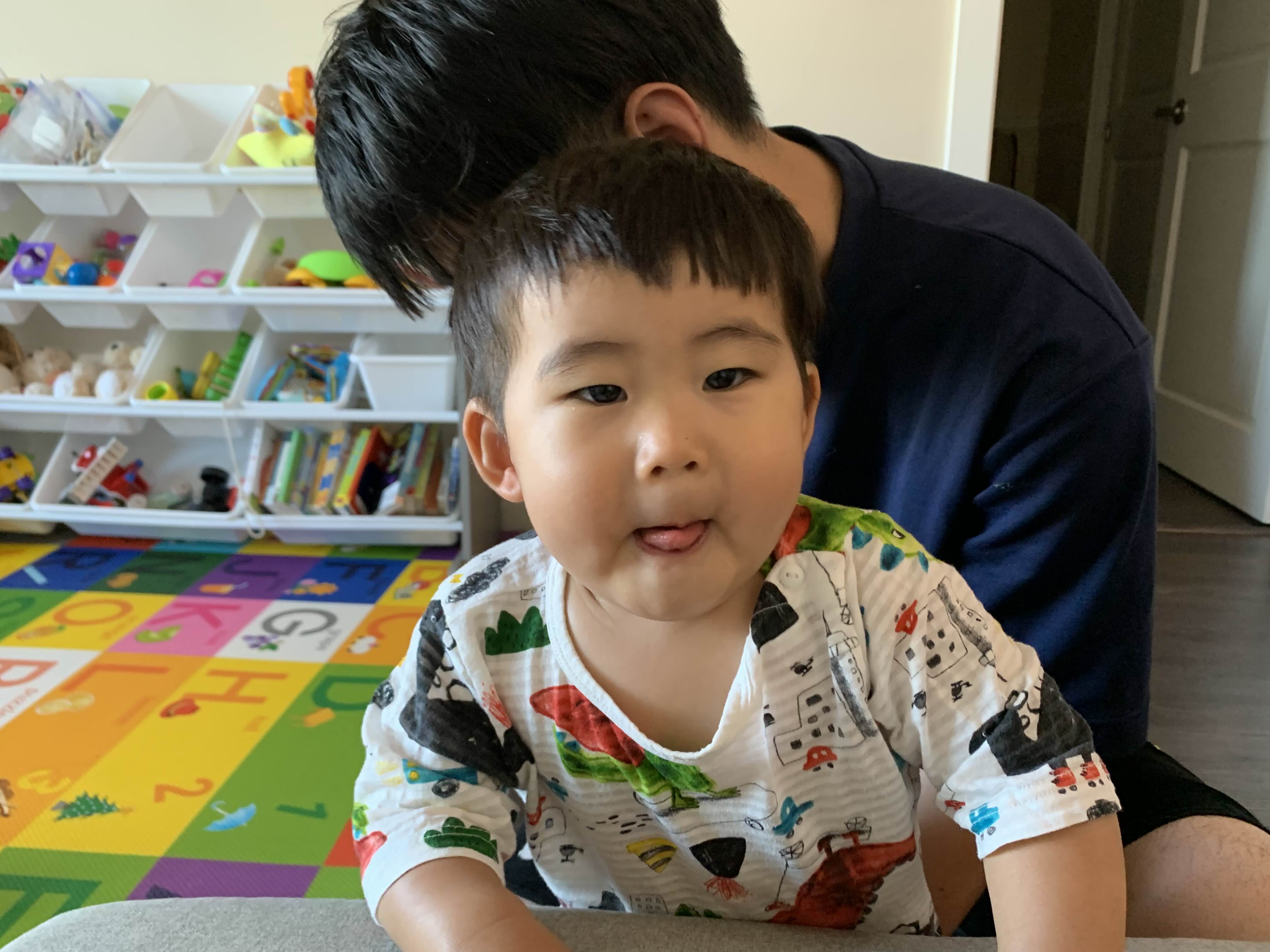 잠옷을 입혀주는 아빠 앞에서 익살스러운 아들! 메롱 귀여워!! ㅎㅎ