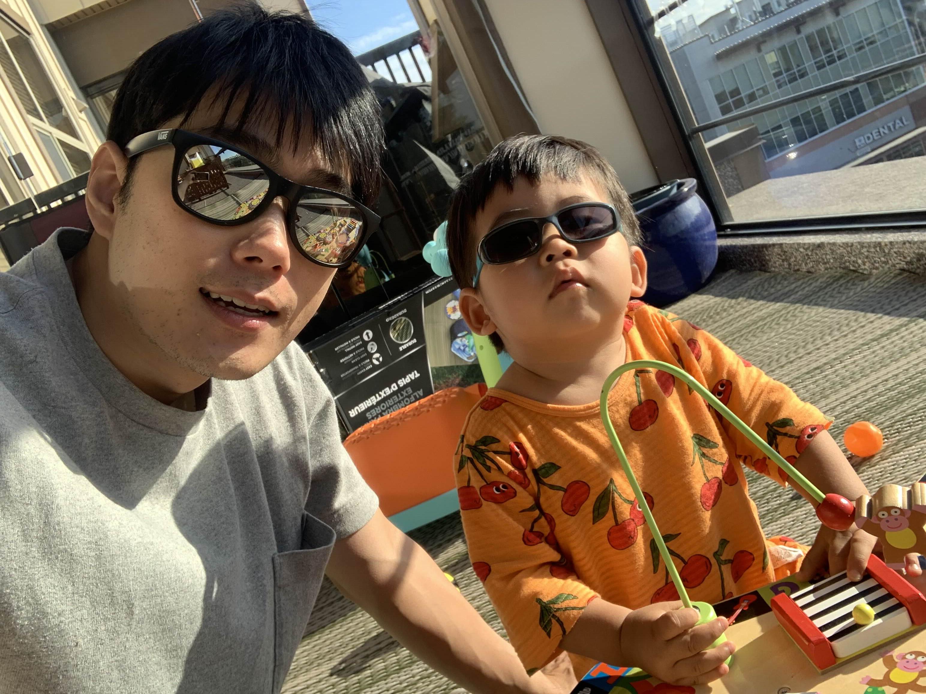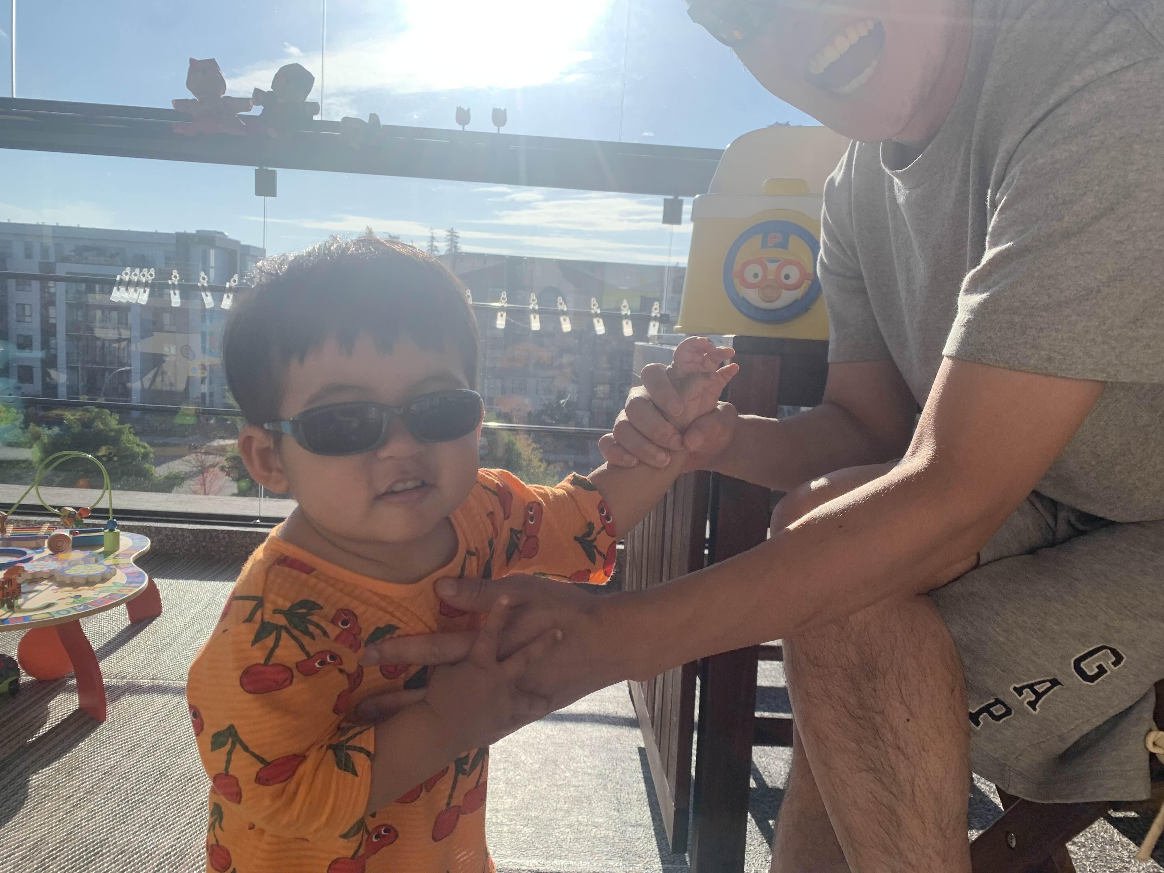 그래도 발코니에서 놀고 싶은 아들은, 결국 선글라스를 쓰고 놀기로.. 아빠도 눈부시니까 아빠도 같이 세트로 씁시다.