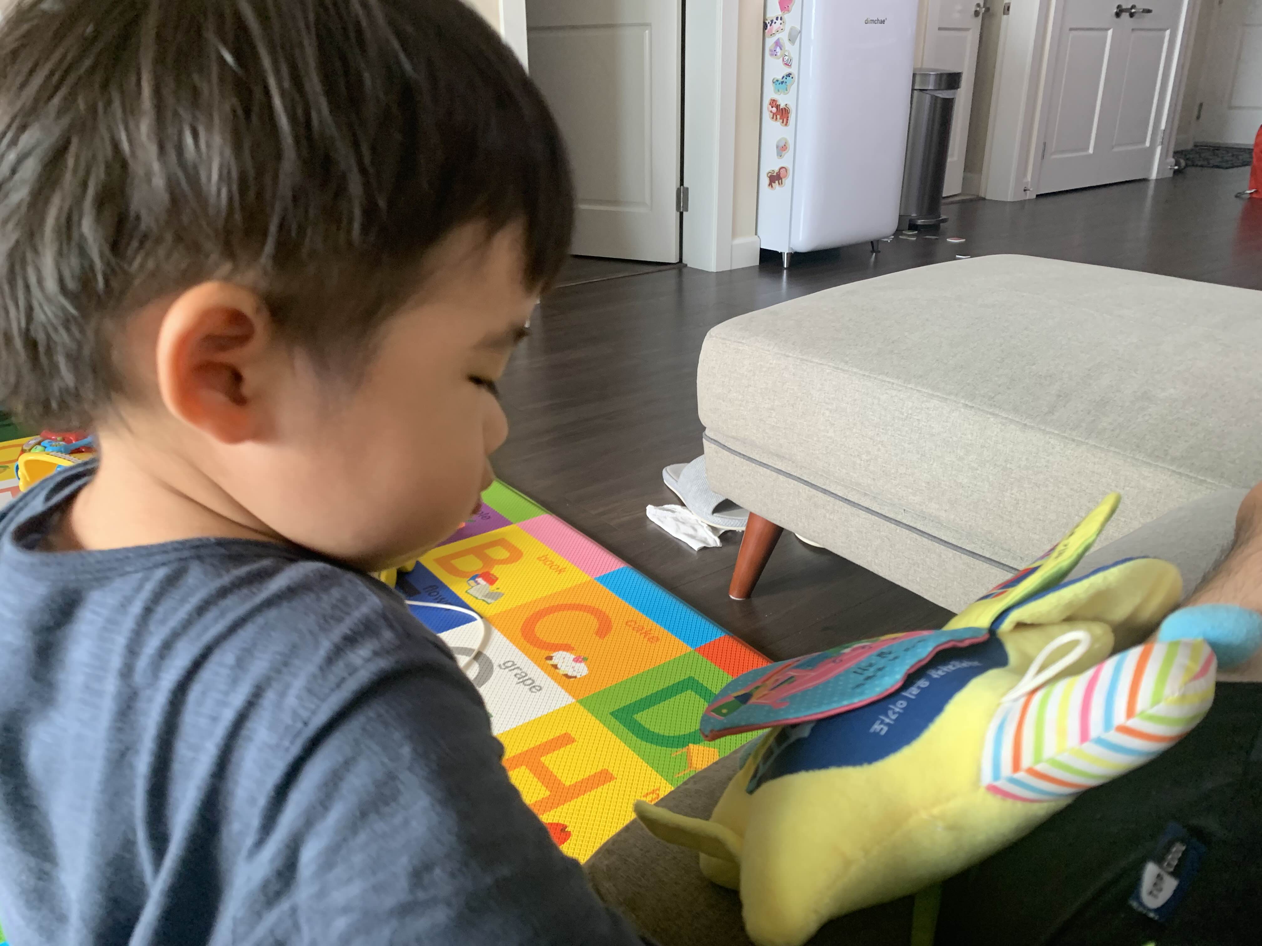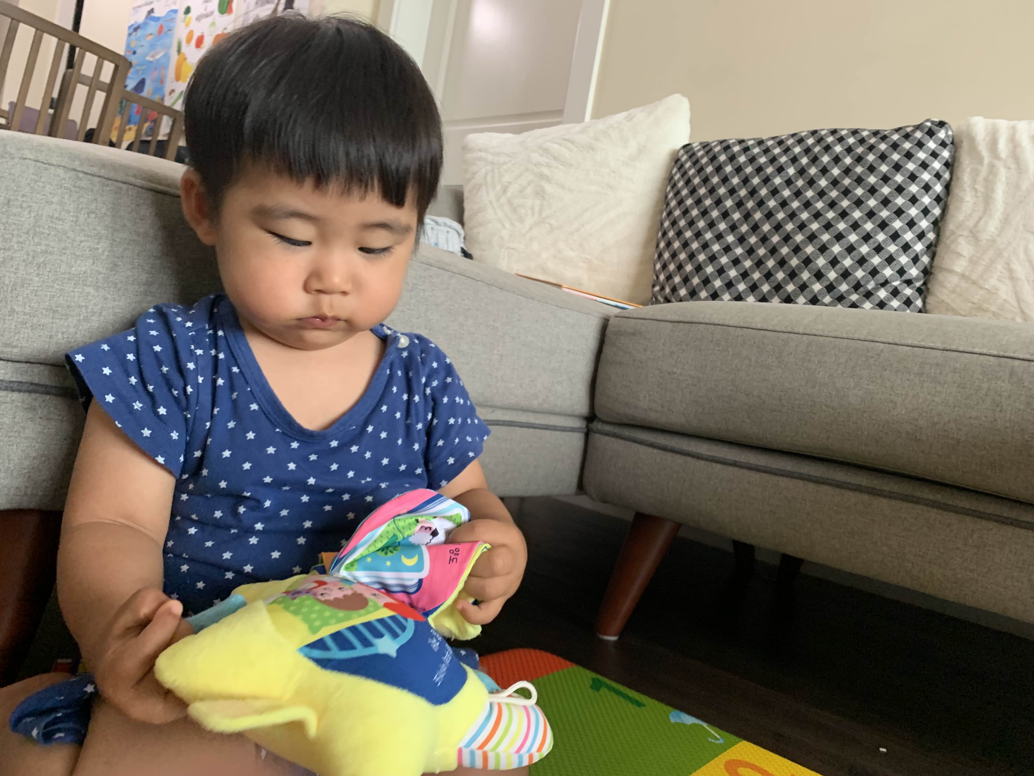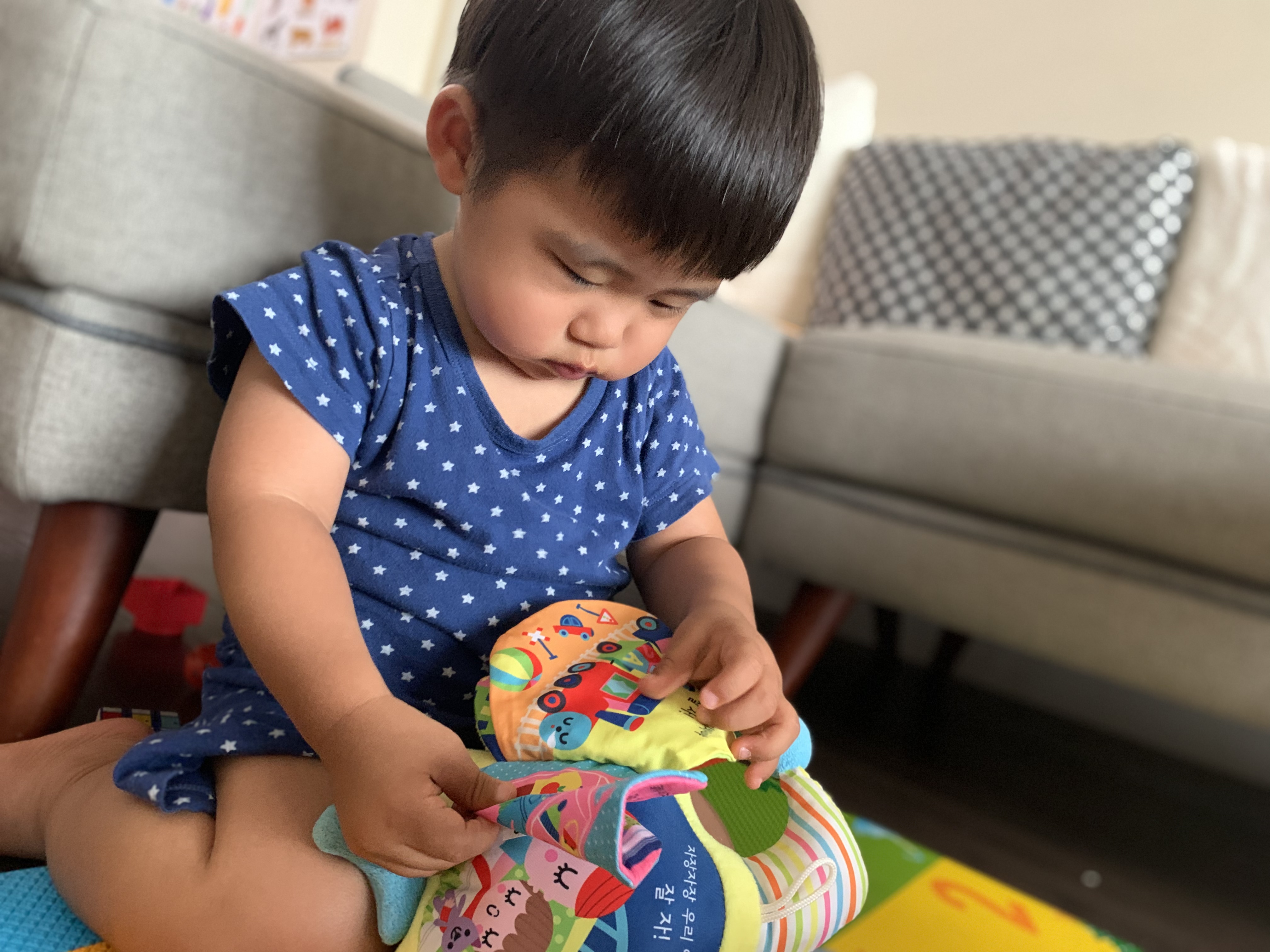 낮잠 자기 전에 너무 징징 대서, 아빠가 이가 아픈가 싶어서 얼음을 조금 줬는데.. 좀 괜찮아졌는지 가만히 앉아서 코코 넨네 책을 읽던 아들..