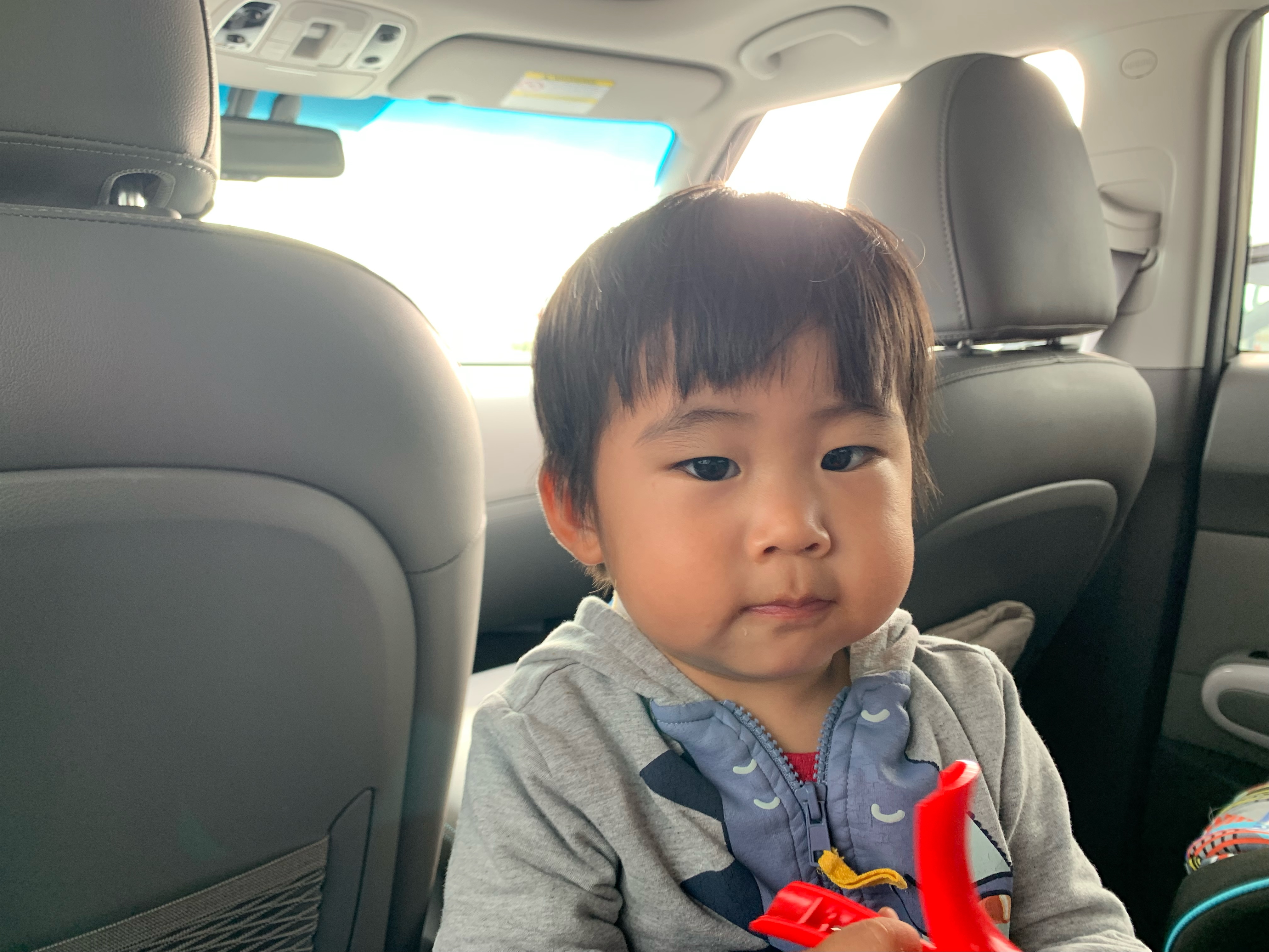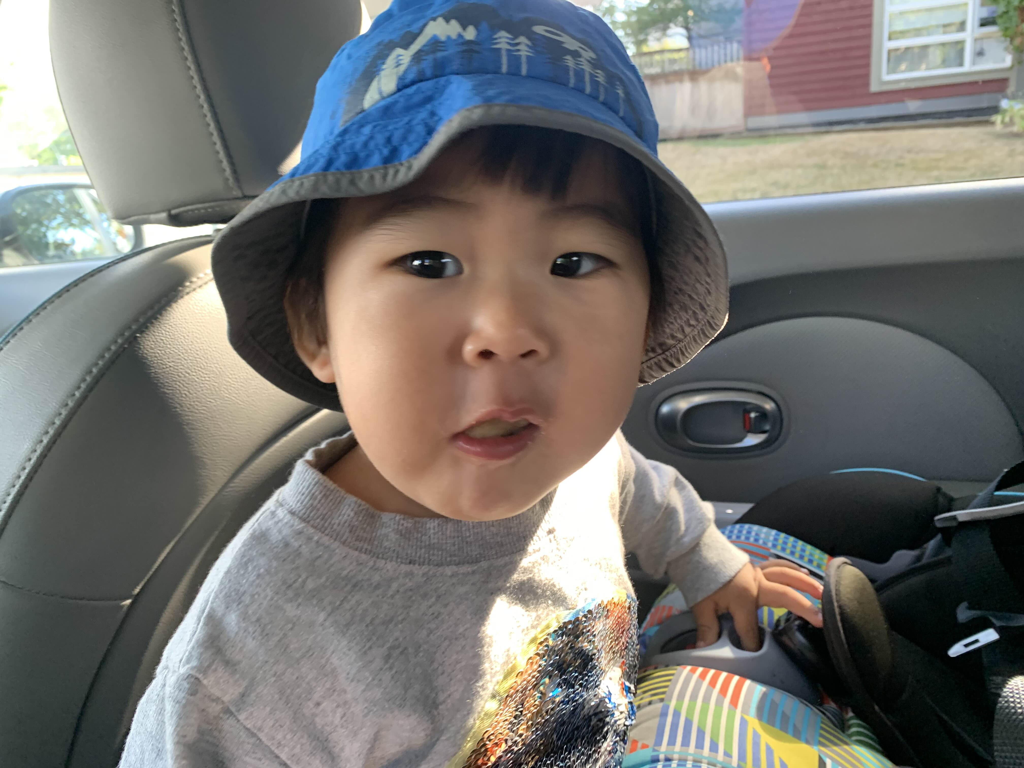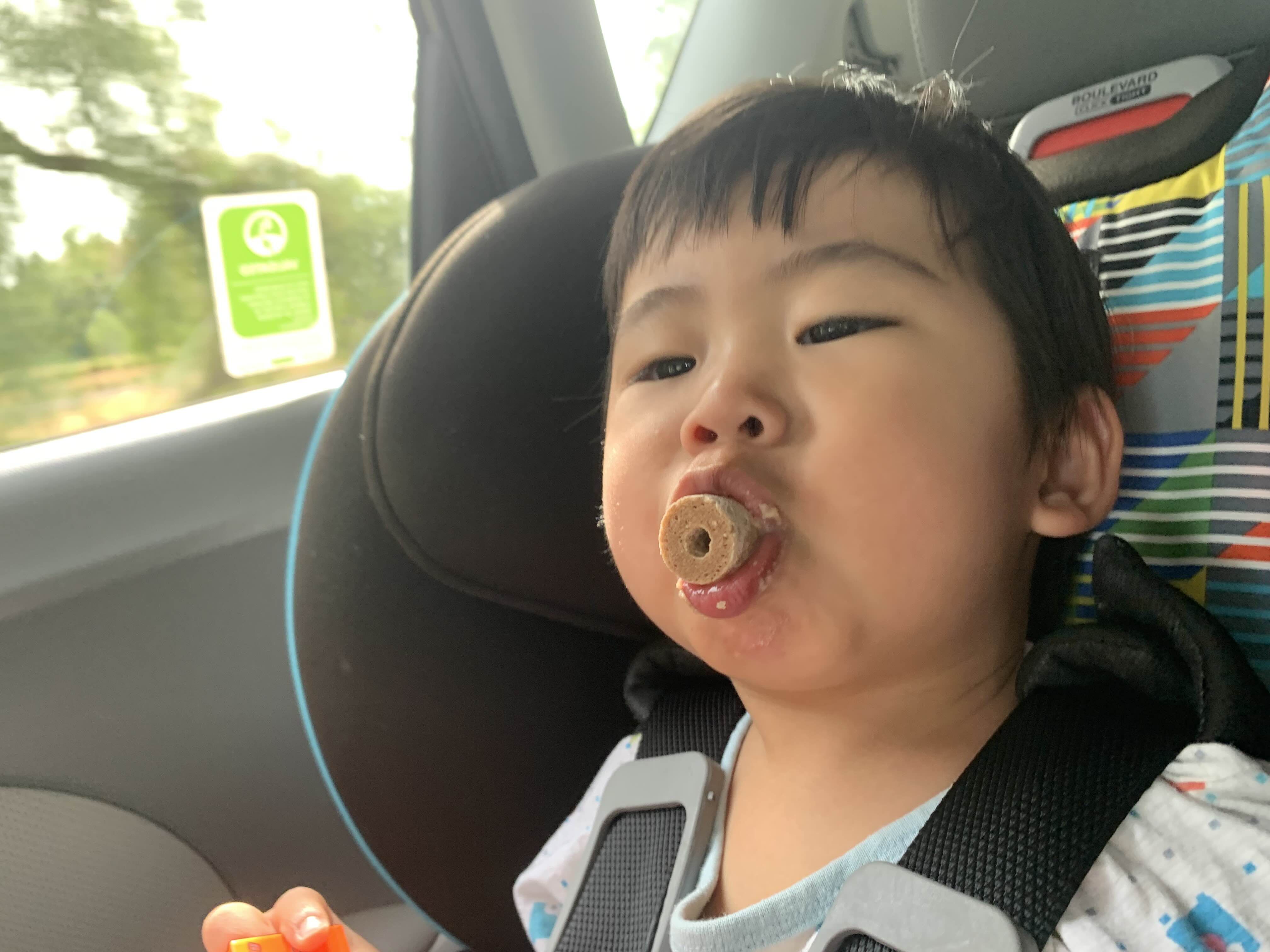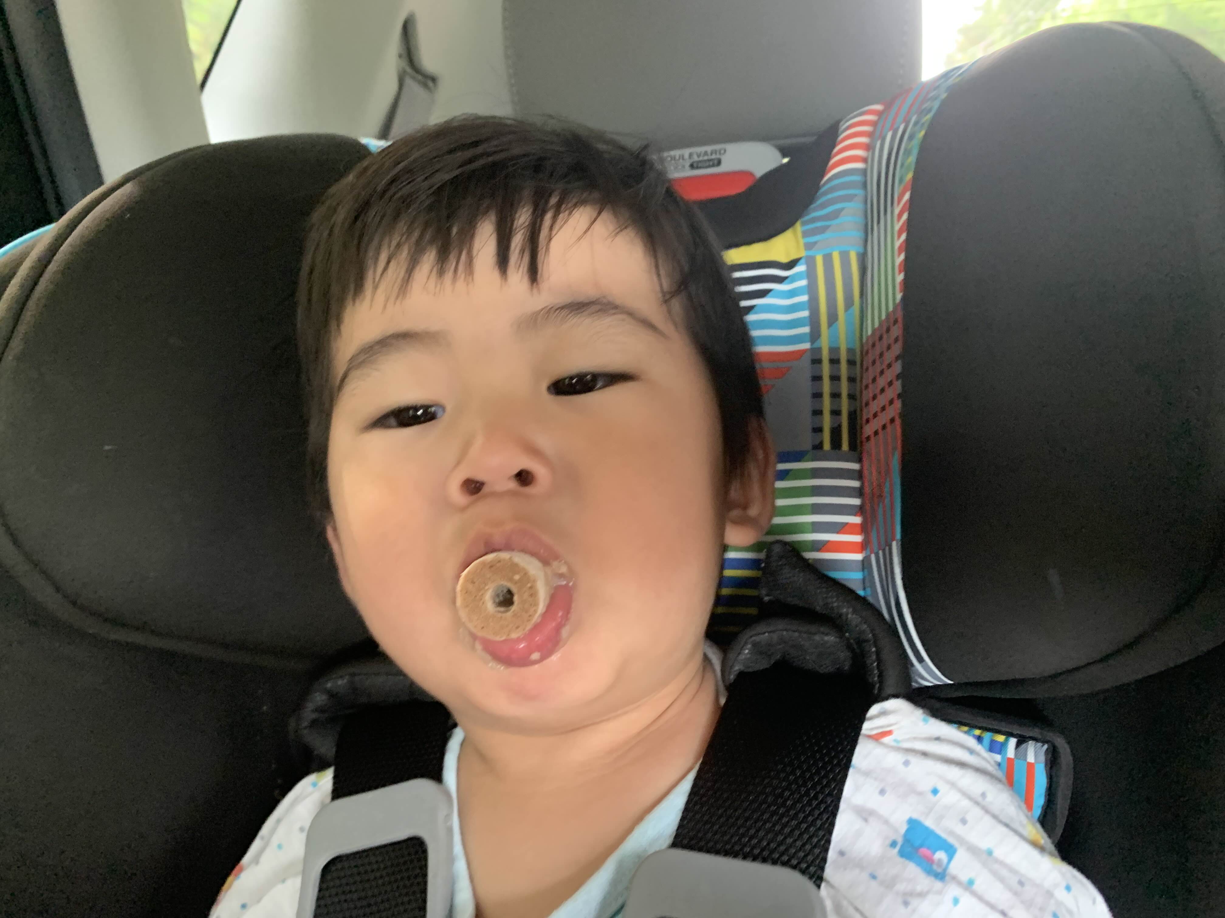 낮잠 자던 아이를 깨워서 후다닥 나오느라 기분이 몹시 안 좋은 태오를 위해.. 까까를 입에 하나 물려주고…