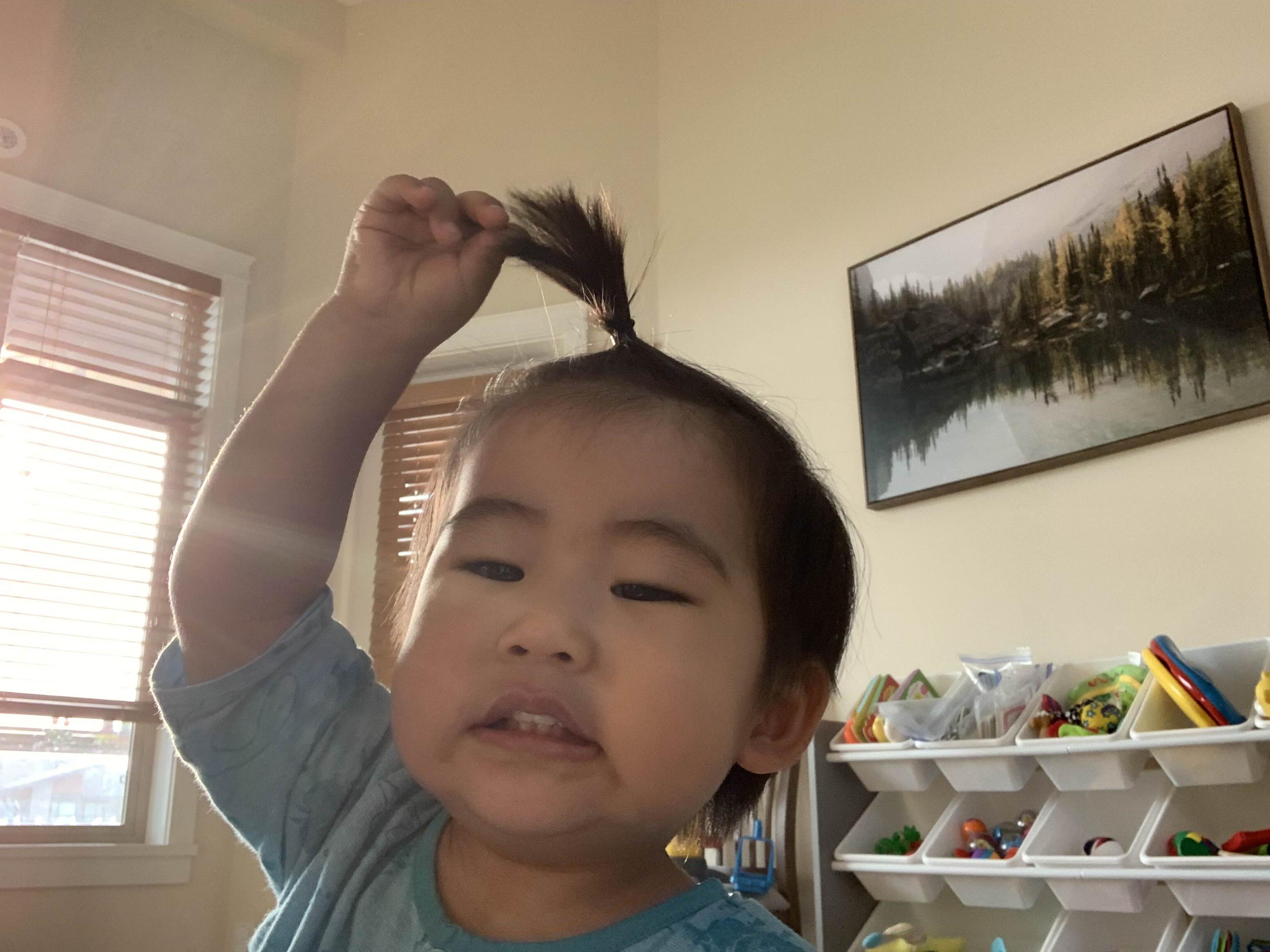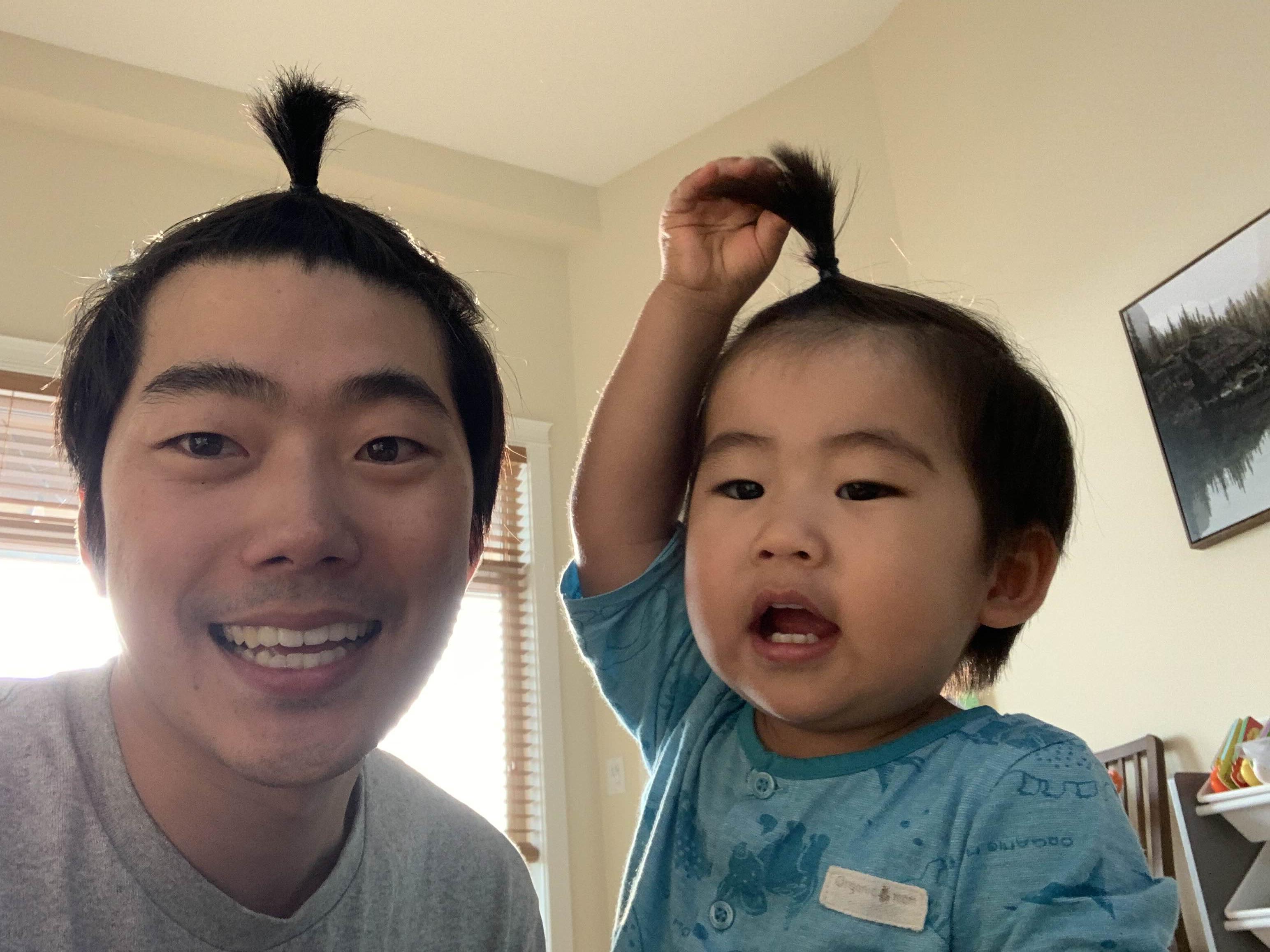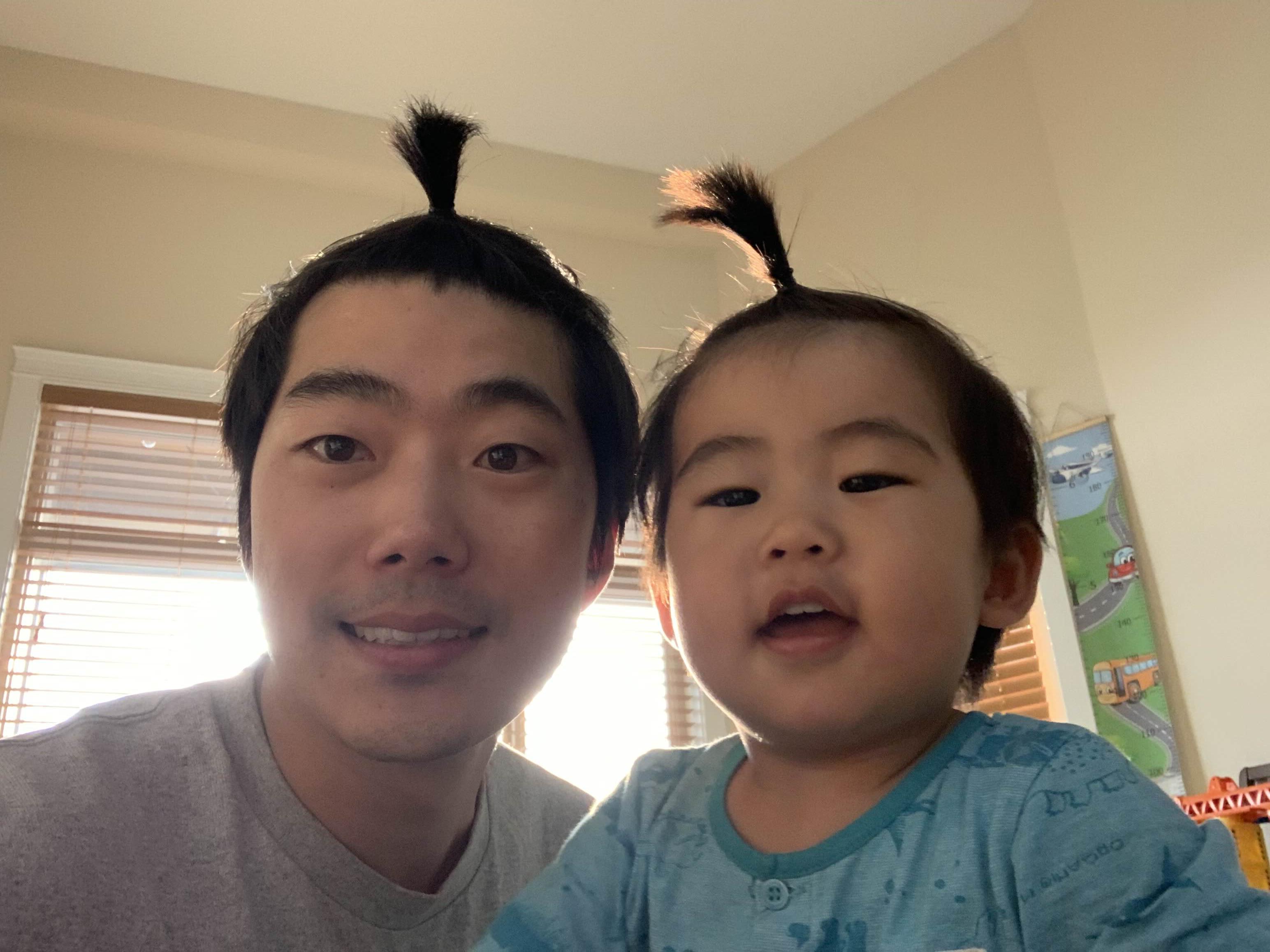 지난주에 미용실에 못 가서, 머리가 길어진 부자의 사과머리 세트!