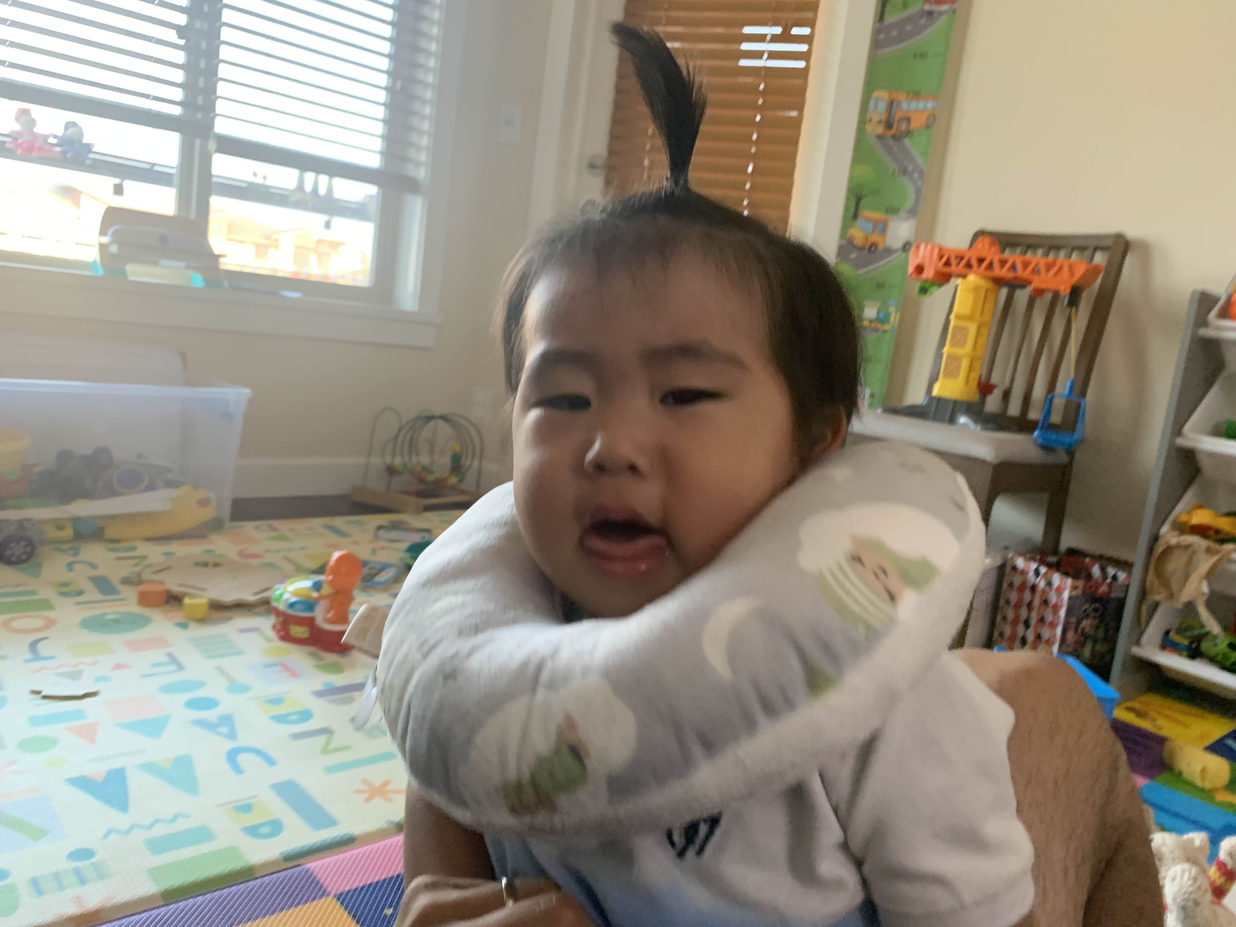 드디어 선물 받은 목베개를 시켜줘 볼까?? 했는데 기분이 몹시 좋지 않으신 아드님...