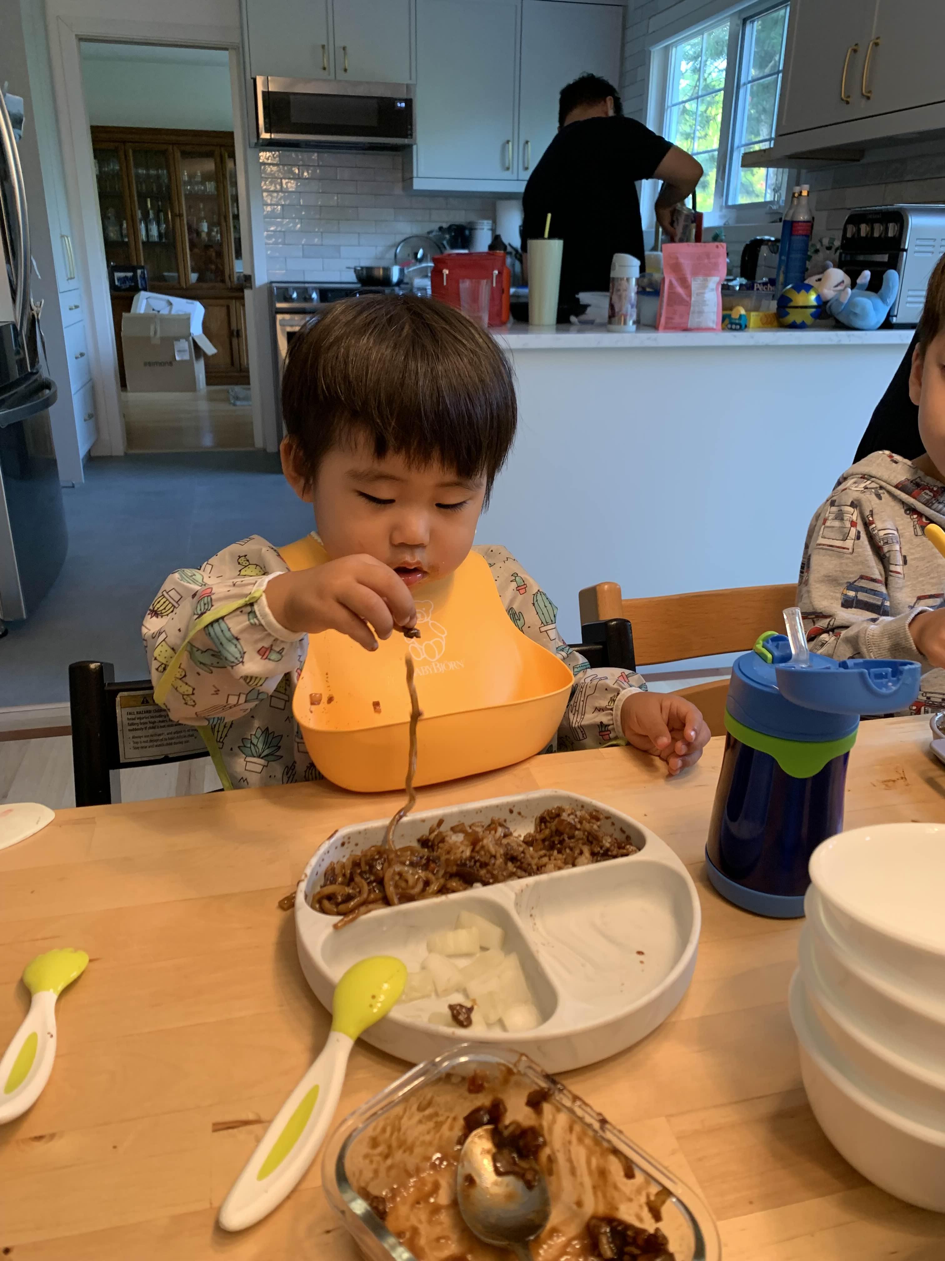 엄마가 메누 잘못 읽어서 짭조름한 파스타가 나왔는데.. 이게 태오가 몹시 마음에 드셨는지 폭풍 흡입... 입에 다 안 들어온다고 짜증 내면서 열심히 손으로 쏙쏙 넣으려고 노력한 아들.. 너무 짠 게 아닐까 걱정이 조금 됐지만, 그래도 가끔인데 하면서 그냥 주기로.. 이렇게 야무지게 먹는데.. 안 줄 수가 없잖아..
