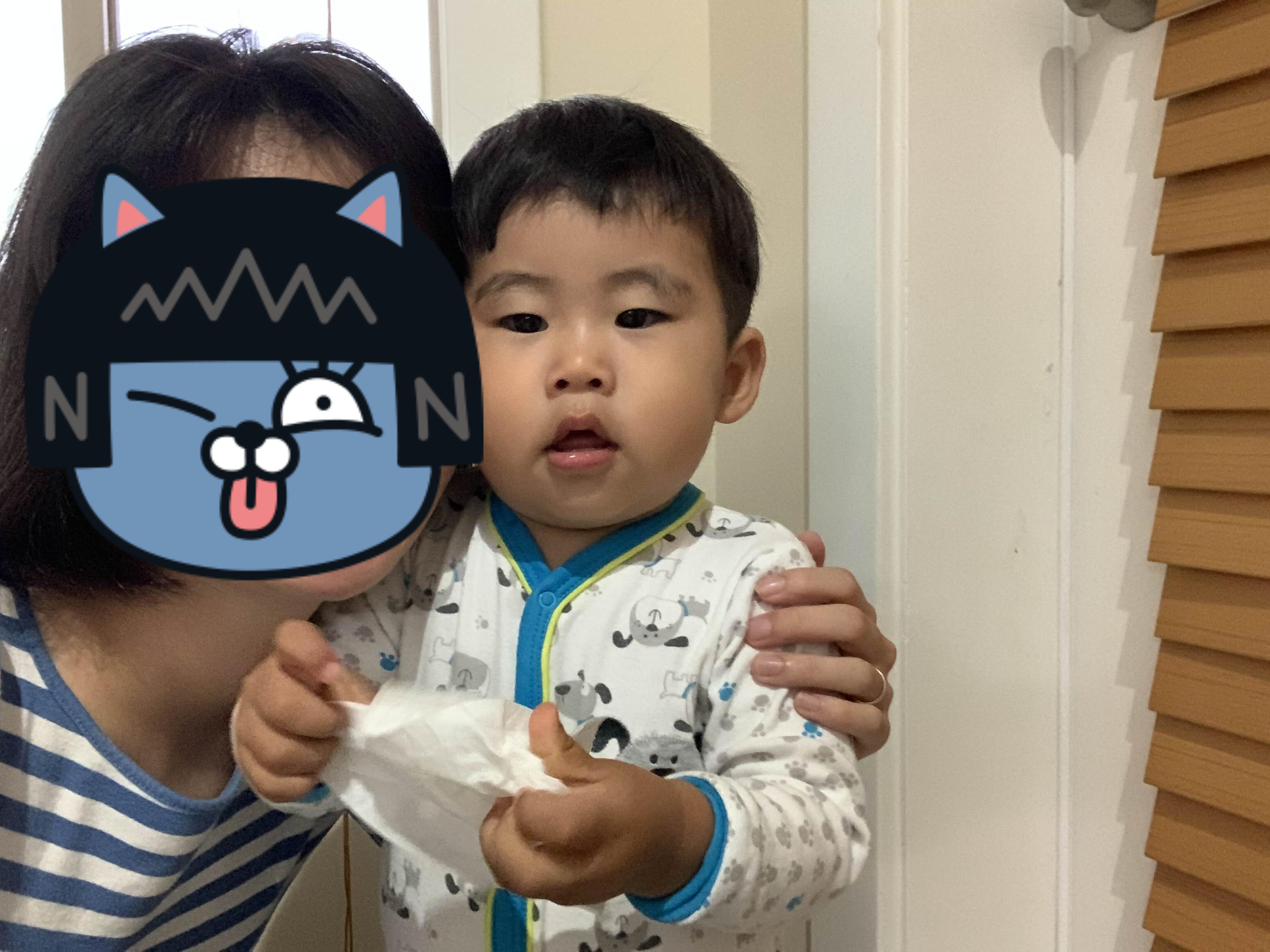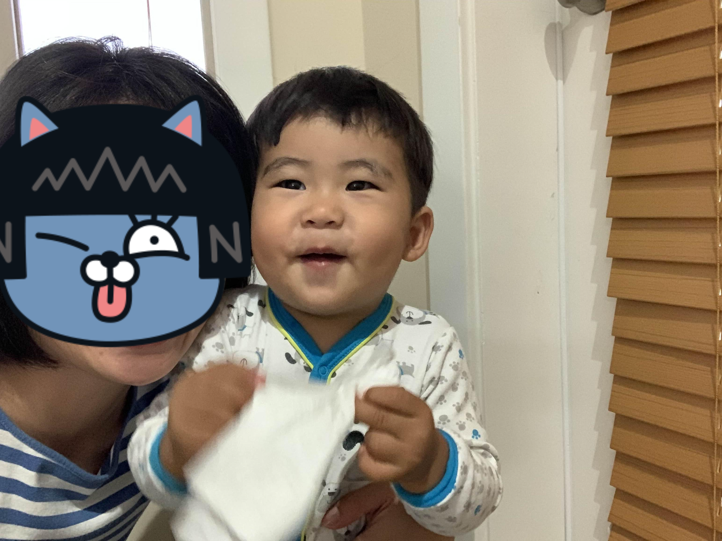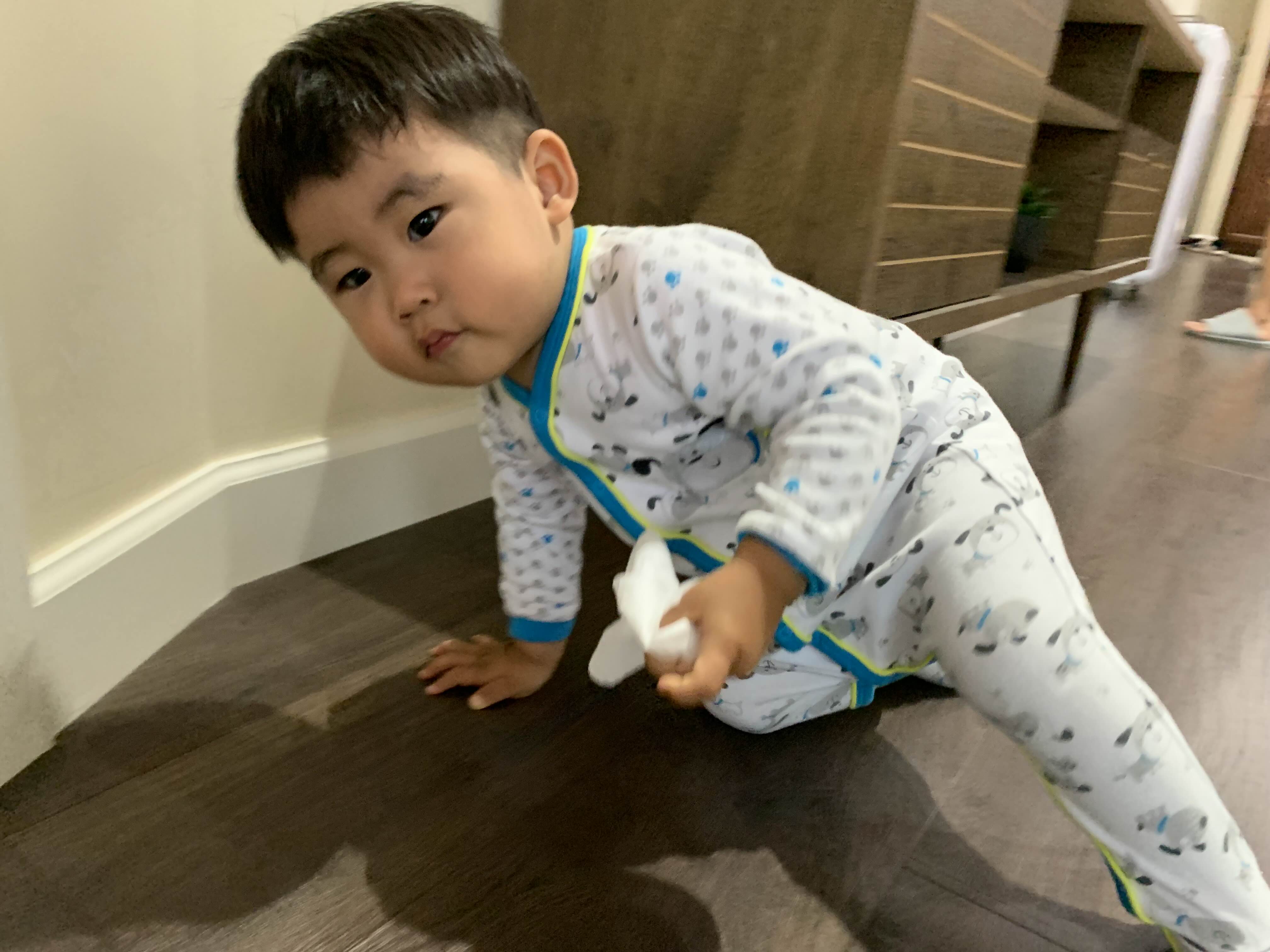 태오도 잠옷을 입고 휴지로 바닥을 닦아요~