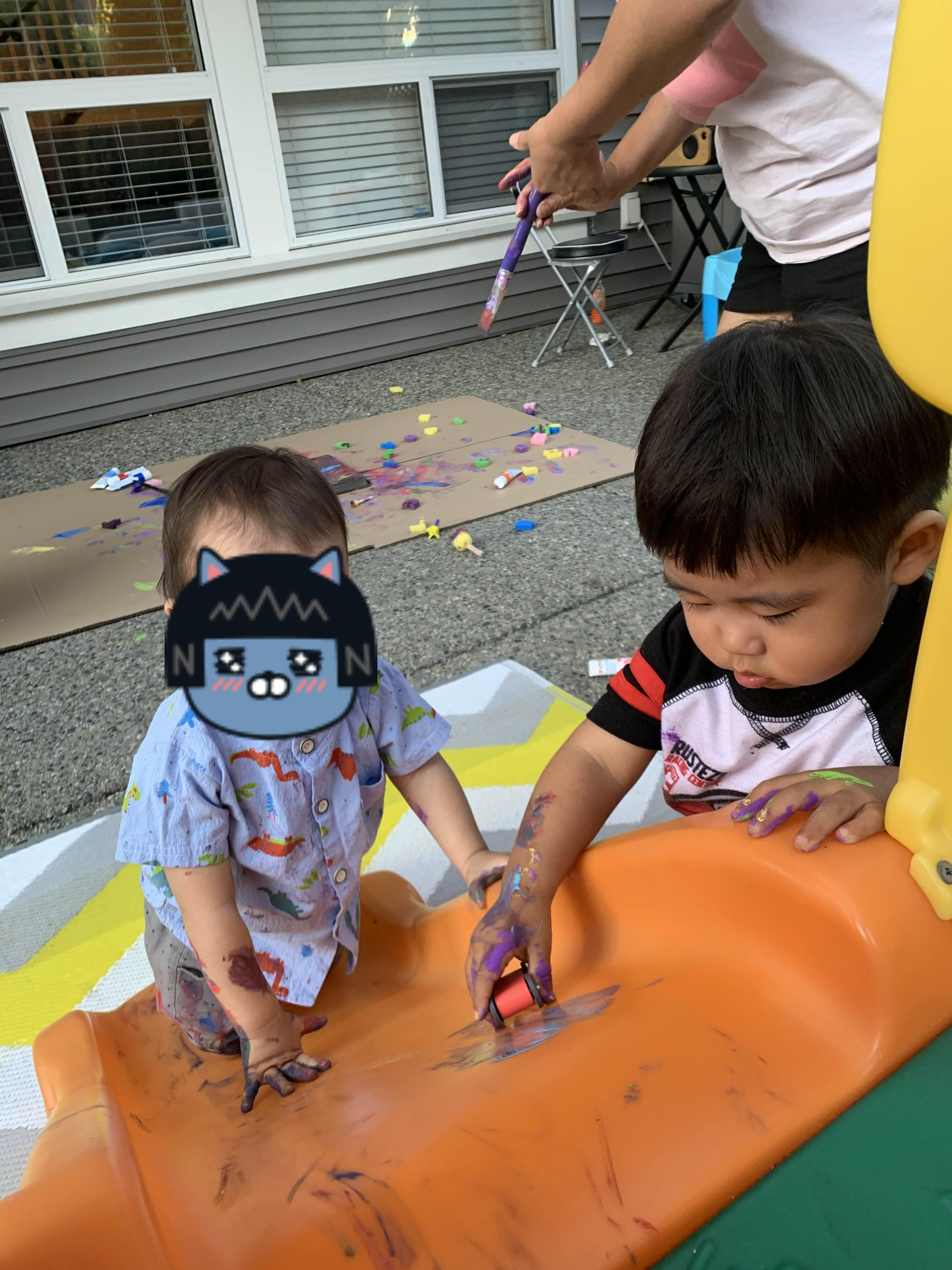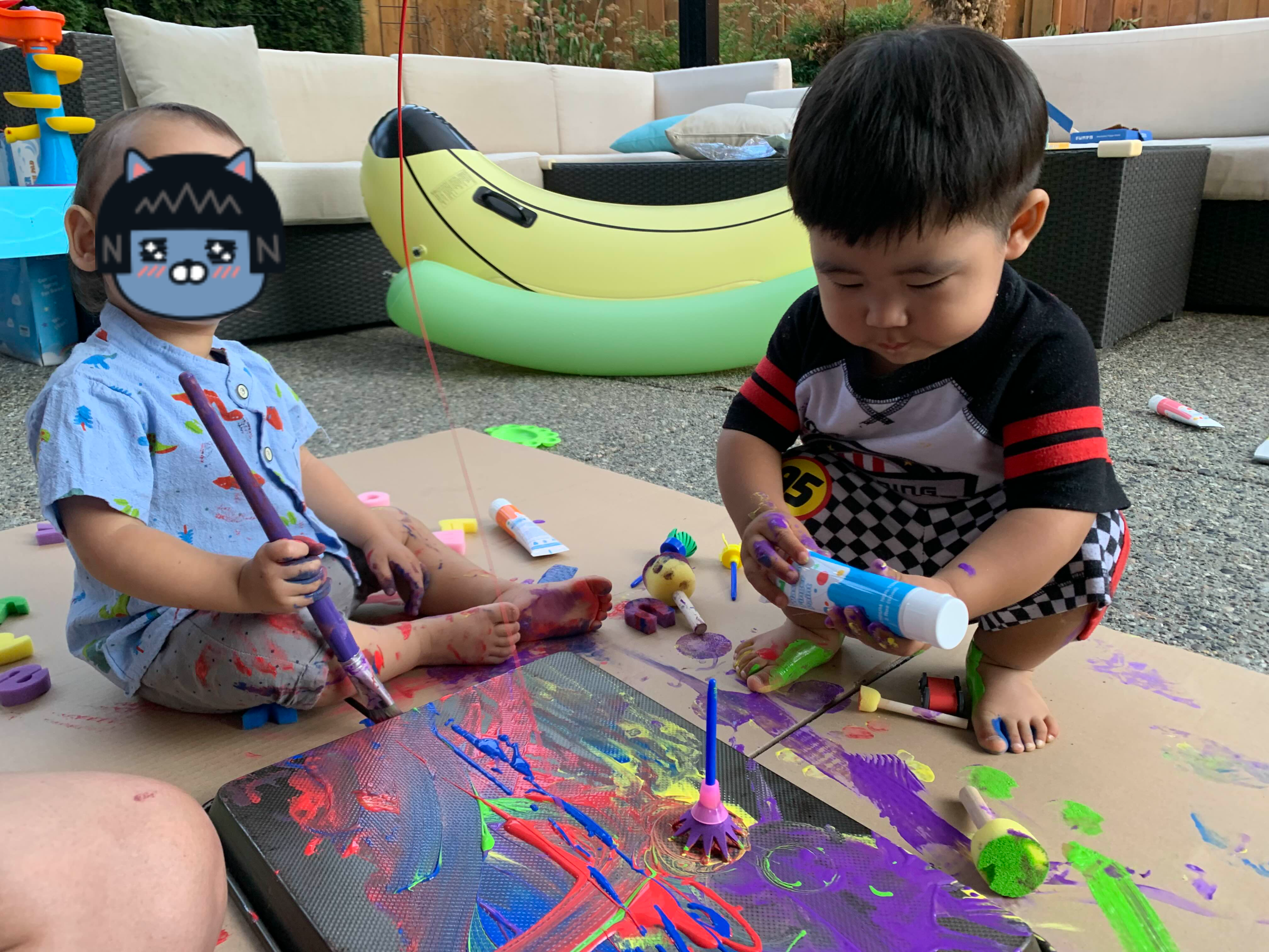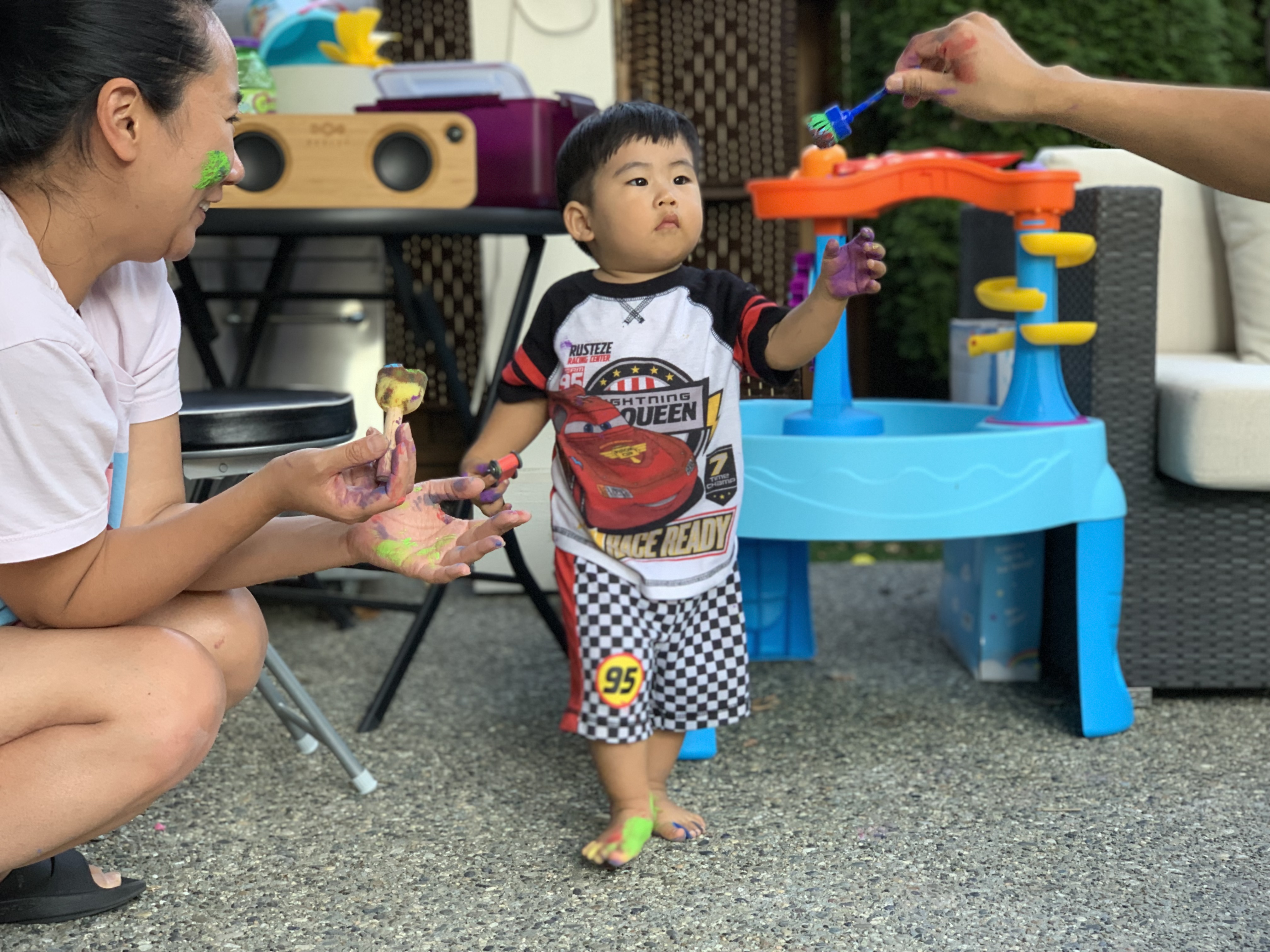 그리고 드디어 오늘! 이모가 비장의 무기로 준비해둔 물감놀이!! 물감보다 물감 통에 더 관심이 있는 아들..