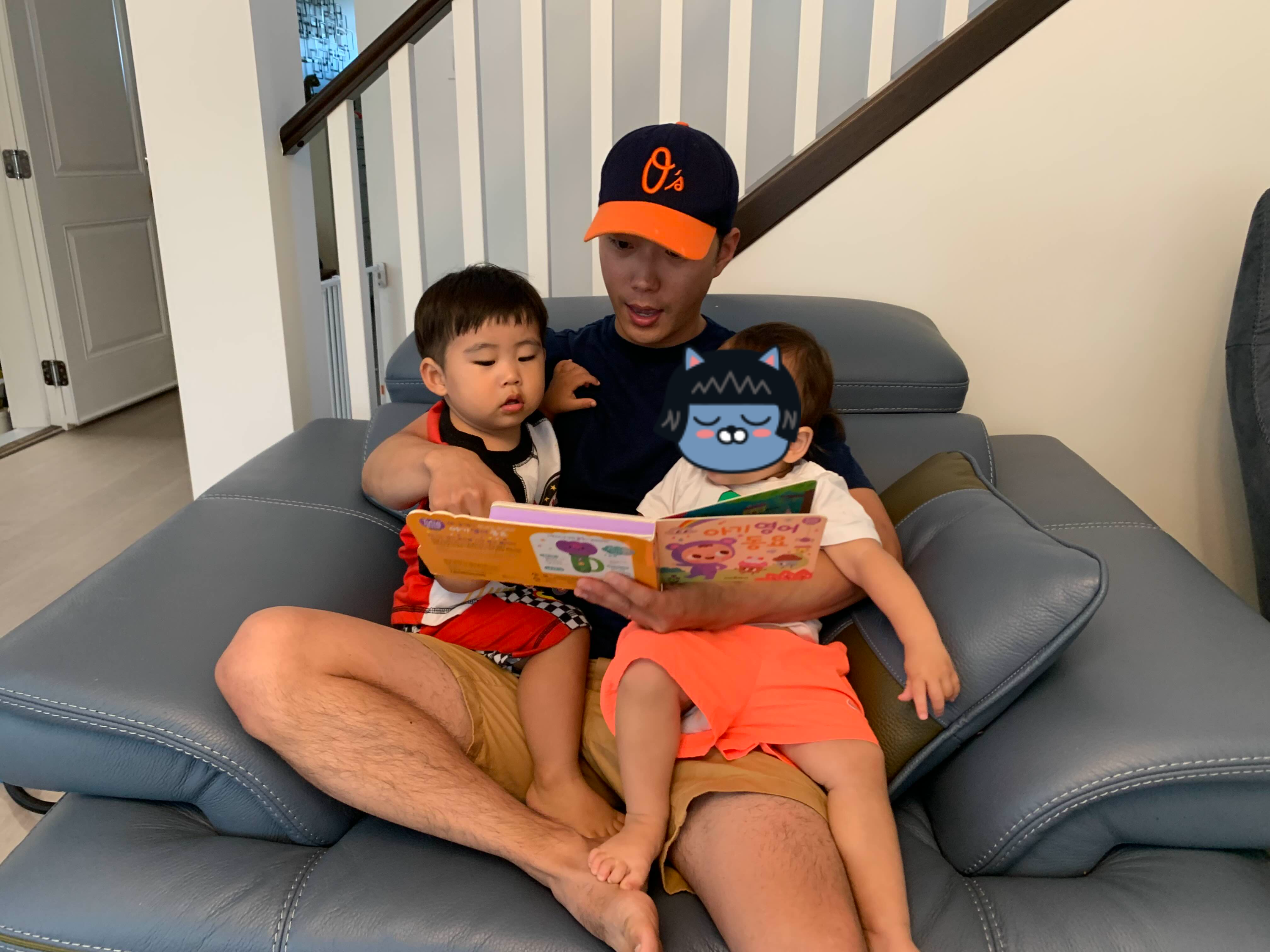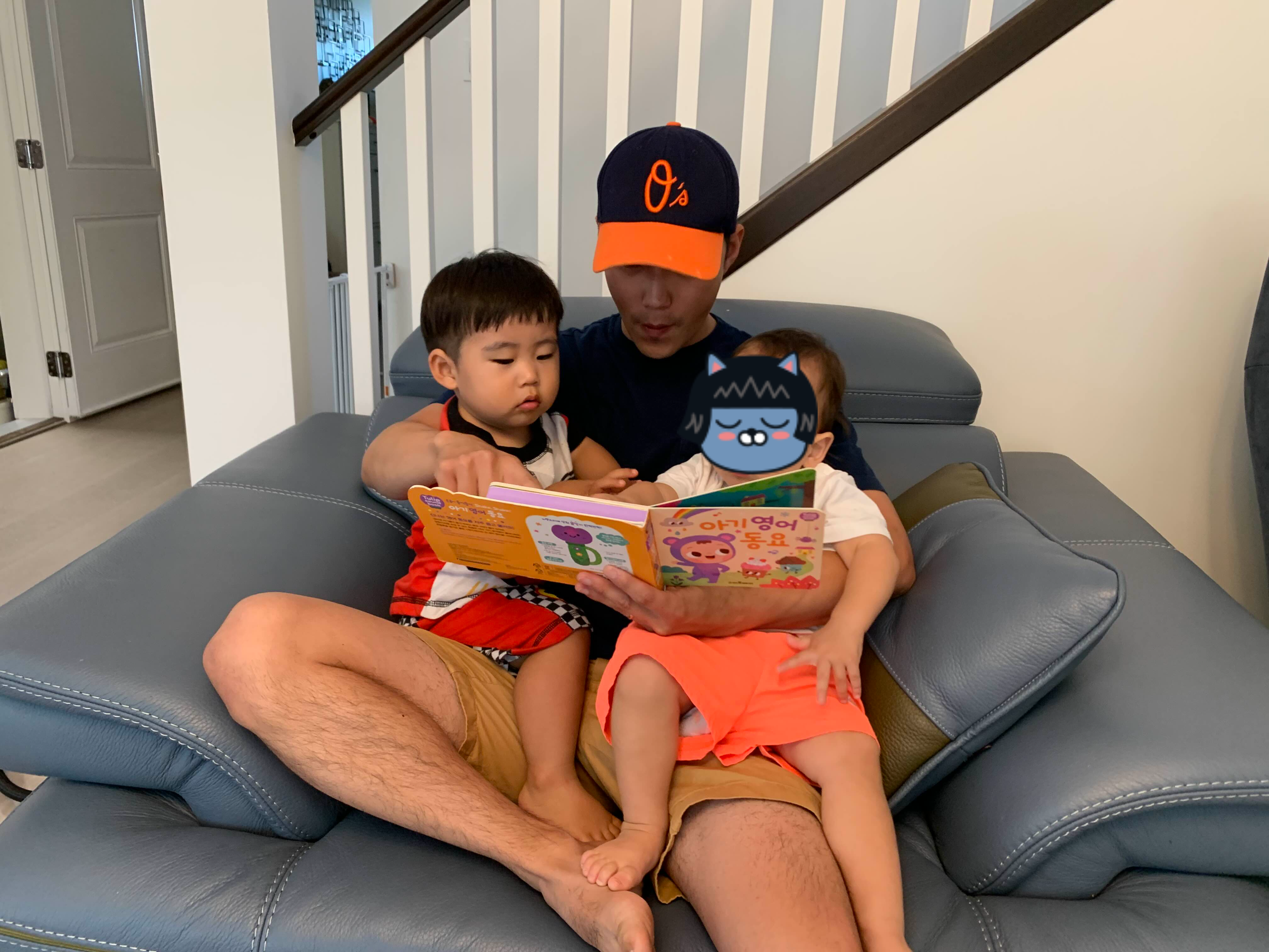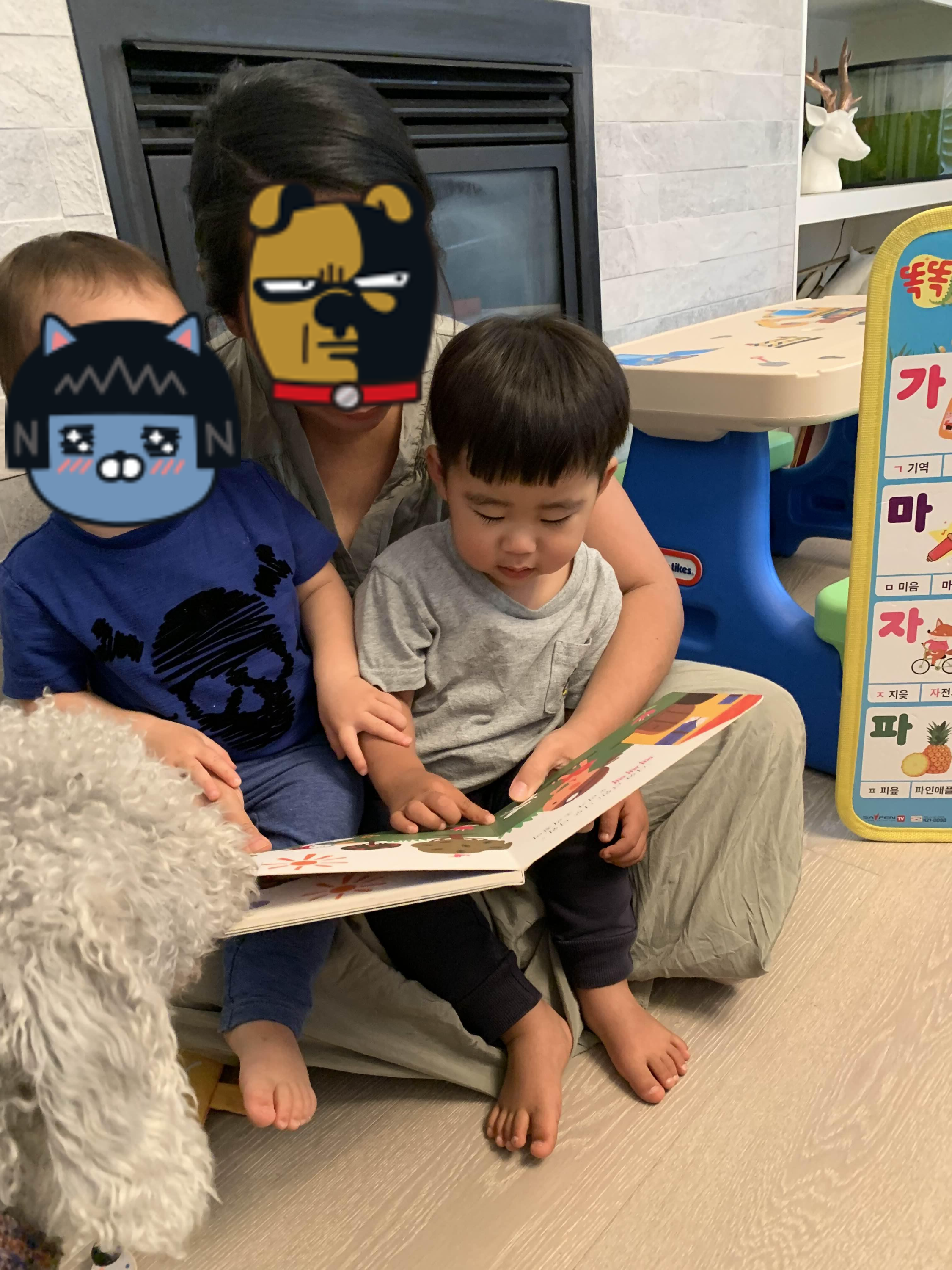 친구네서 아빠가 태오랑 친구랑 같이 동요 책을 읽어 줬어요! 아주 안정적으로 같이 안겨 있는 아이들!