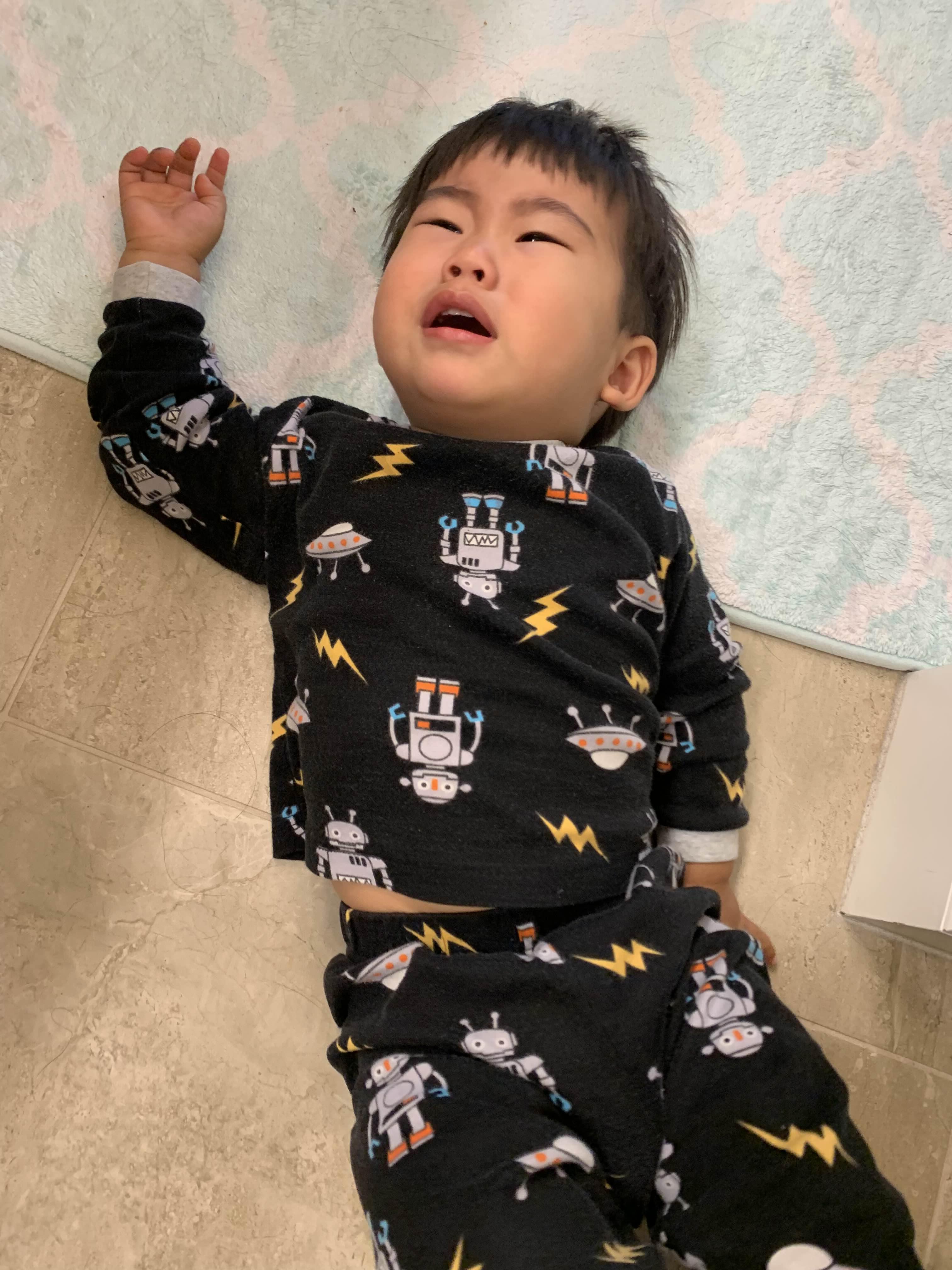 아침 먹을 때 안 먹고 난동을 피우길래, 아침을 그냥 치워 버렸더니.. 엄마 출근하자마자 배고프다고 화장실 바닥에 누워서 짱꾸 부리던 아들.. 아빠는 덕분에 배로 힘들었지요..