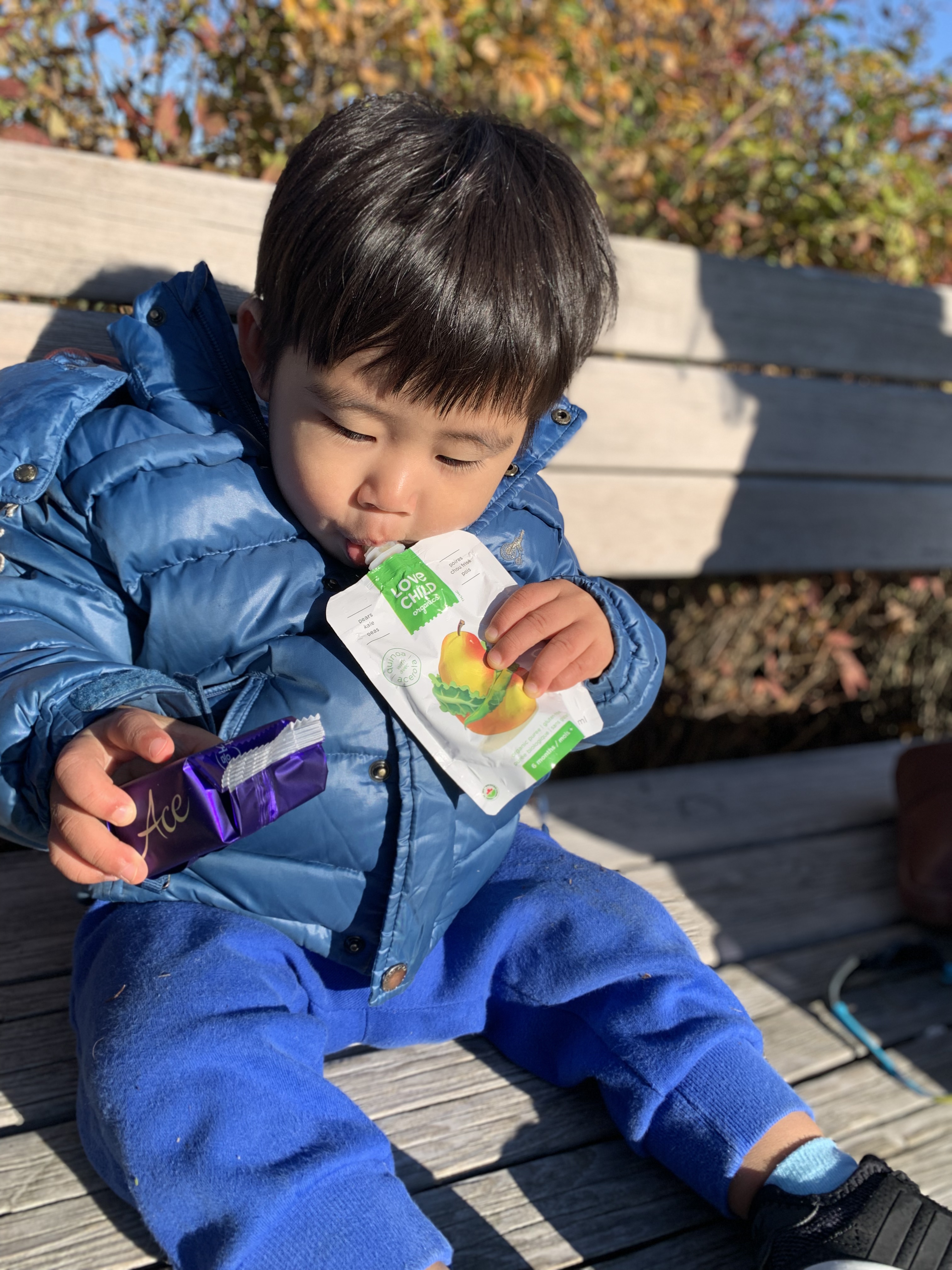 오후 산책 나와서, 벤치에 앉아서 파우치도 먹고, 까까도 손에 들고 ㅎㅎ 날씨가 아주 좋아서 기분이 몹시 좋아요!