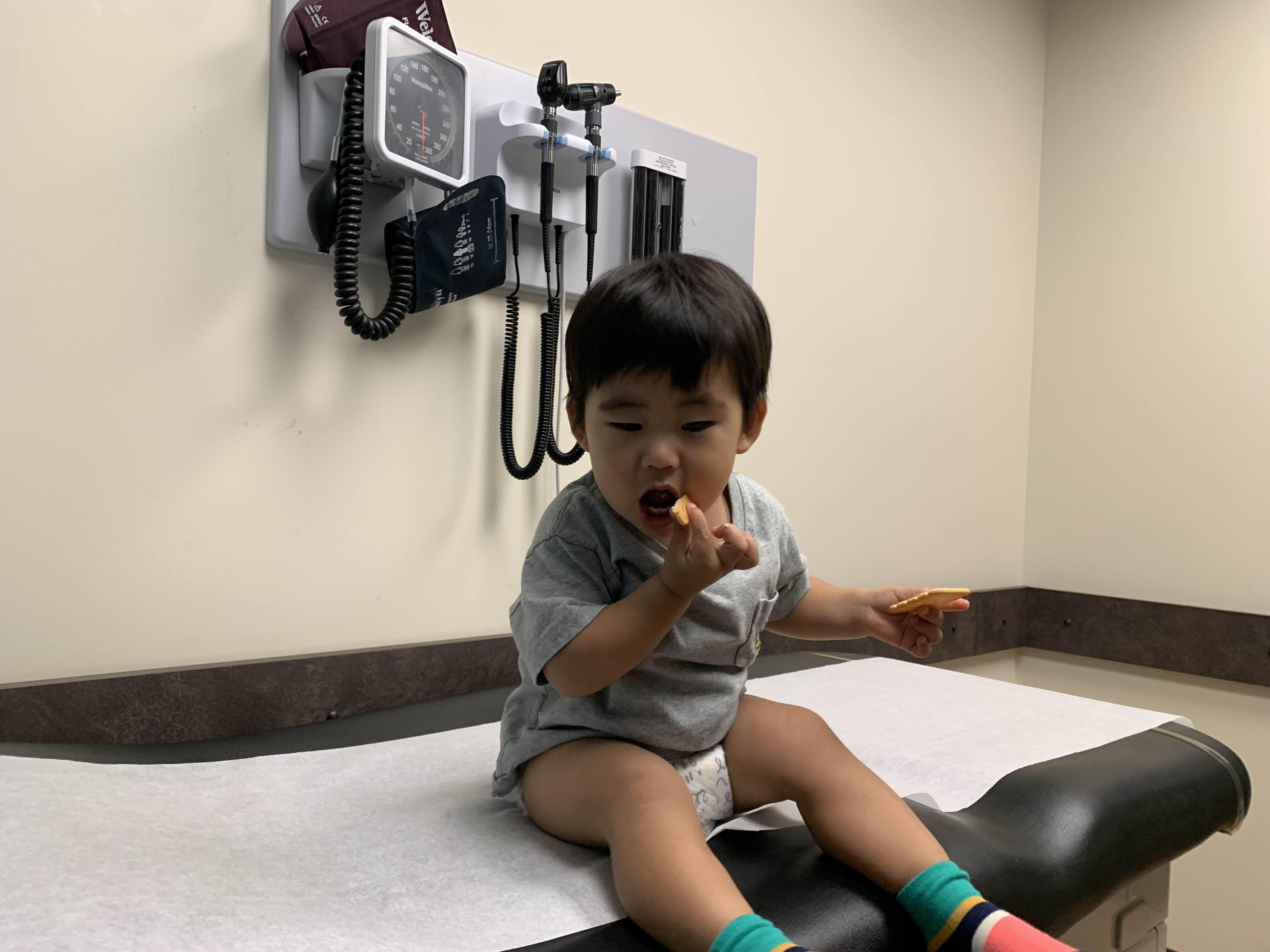 저번에 왔을 때와 다르게, 진료대에도 아주 안정적으로 잘 앉아 있는 아들! 우리 아들 몸무게는 상위권인데.. 키는 아직 중위권밖에 안 되는 아주 통통한 아들..