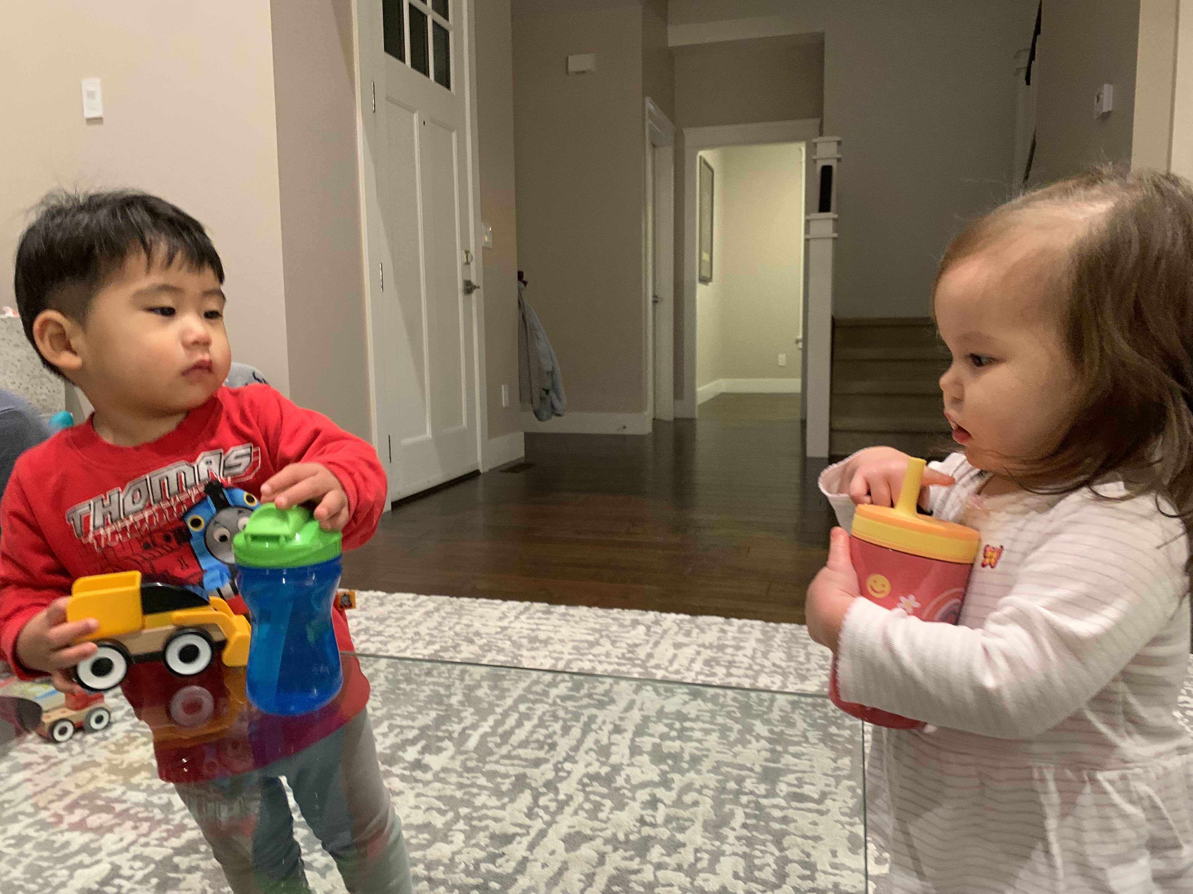 시아네 불도저가 생겨서! 아주 신나게 놀아요!! 둘이 서로의 물병 꼭 껴안고 ㅎㅎ