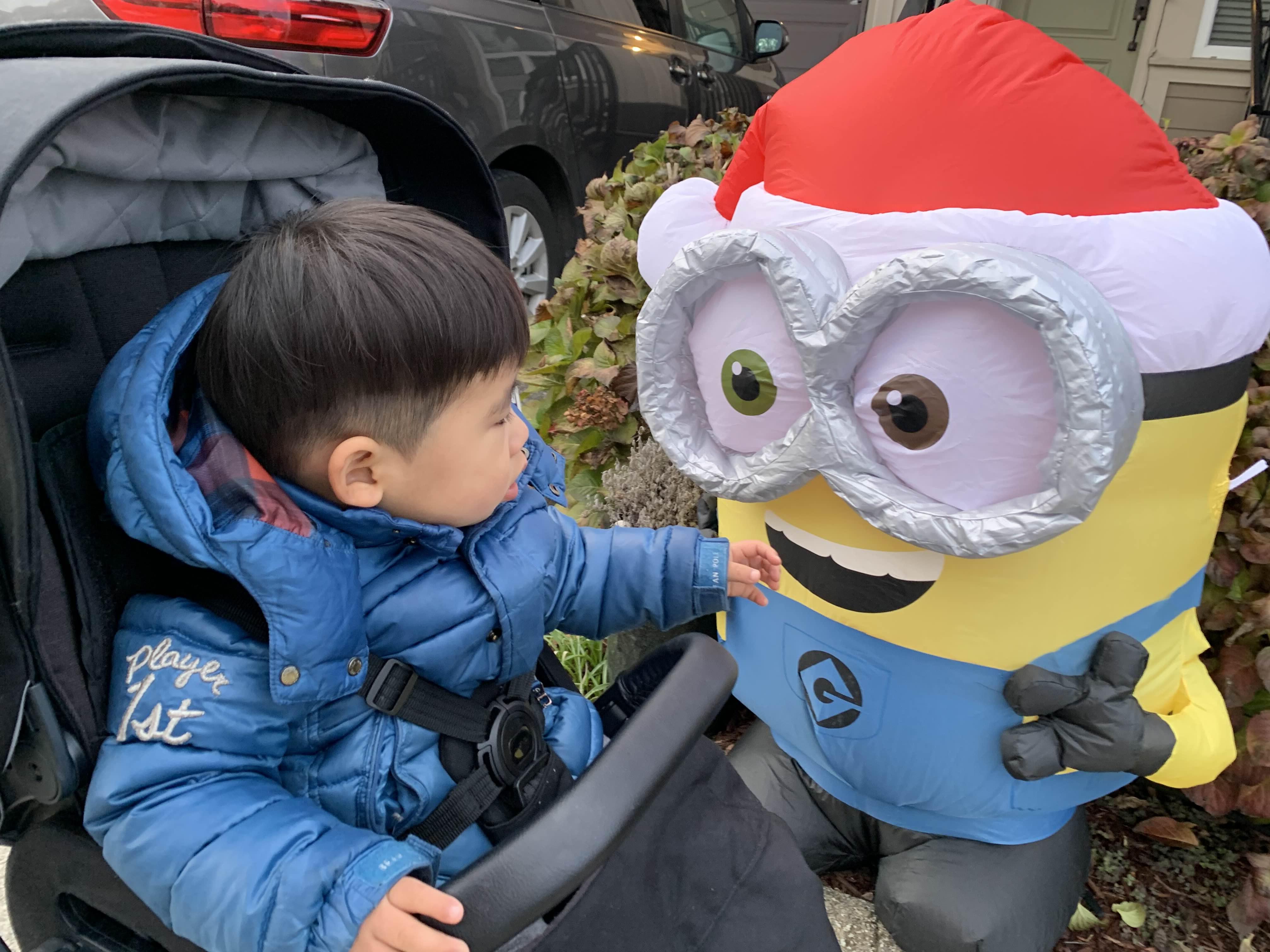 그리고 집에 가는 길에 만난 민니언 산타!! 안녕!! 타는 태오야! ㅎㅎ
